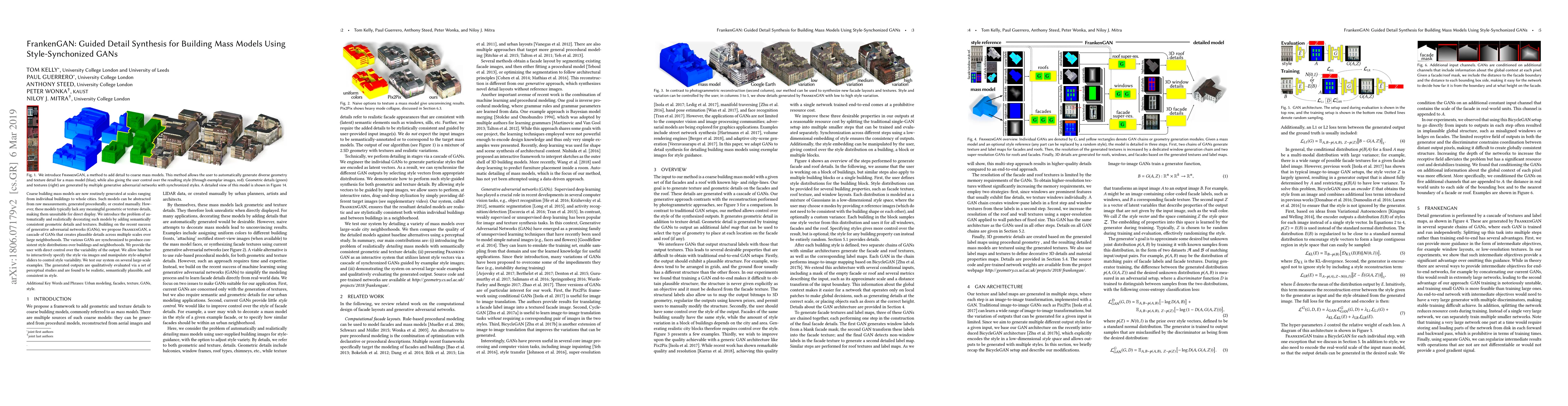 Coarse building mass models are now routinely generated at scales ranging from individual buildings through to whole cities. For example, they can be abstracted from raw measurements, generated procedurally, or created manually. However, these models typically lack any meaningful semantic or texture details, making them unsuitable for direct display. We introduce the problem of automatically and realistically decorating such models by adding semantically consistent geometric details and textures. Building on the recent success of generative adversarial networks (GANs), we propose FrankenGAN, a cascade of GANs to create plausible details across multiple scales over large neighborhoods. The various GANs are synchronized to produce consistent style distributions over buildings and neighborhoods. We provide the user with direct control over the variability of the output. We allow her to interactively specify style via images and manipulate style-adapted sliders to control style variability. We demonstrate our system on several large-scale examples. The generated outputs are qualitatively evaluated via a set of user studies and are found to be realistic, semantically-plausible, and style-consistent.