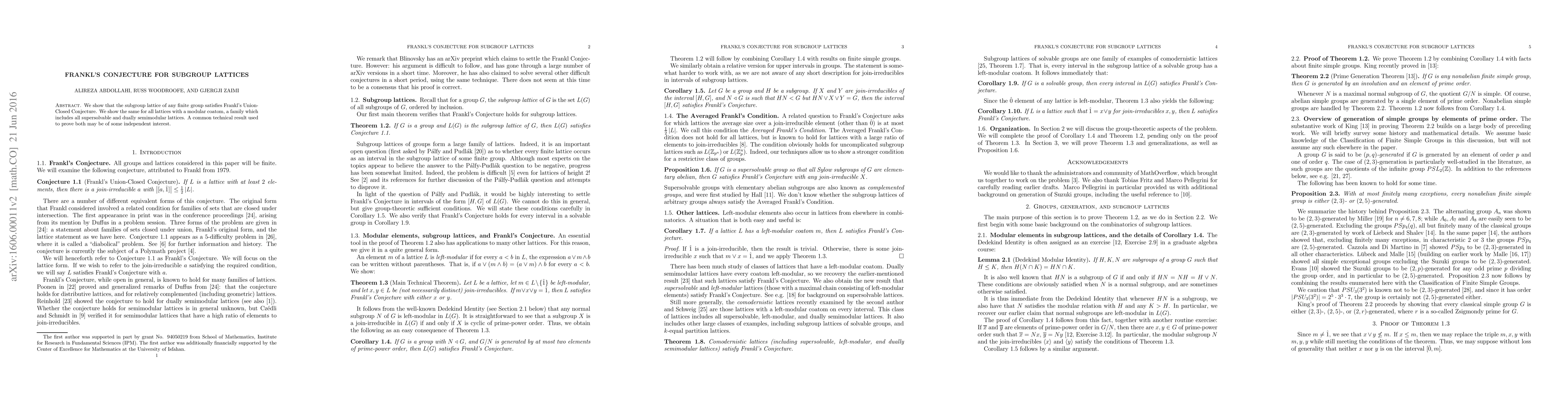 The paper proves Frankl's Union-Closed Conjecture for subgroup lattices of any finite group and for all lattices with a modular coatom, including supersolvable and dually semimodular lattices. A key technical result utilized in these proofs could also hold independent significance.