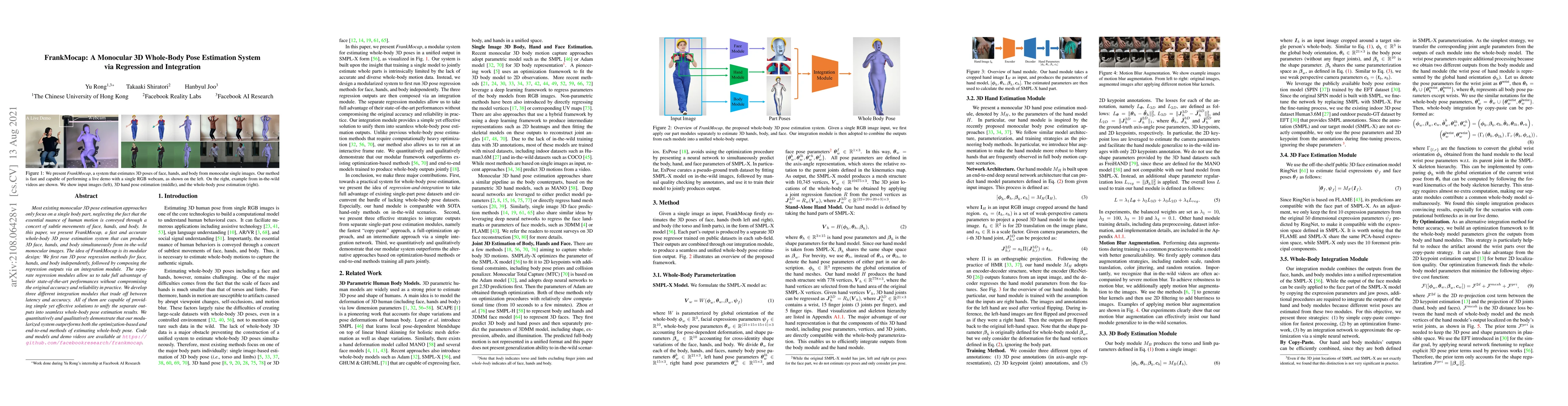 FrankMocap presents a modular system for accurate 3D whole-body pose estimation from monocular images, utilizing independent regression for face, hands, and body parts followed by an integration module to unify the results. The approach outperforms existing optimization-based and end-to-end methods in both quantitative and qualitative assessments.