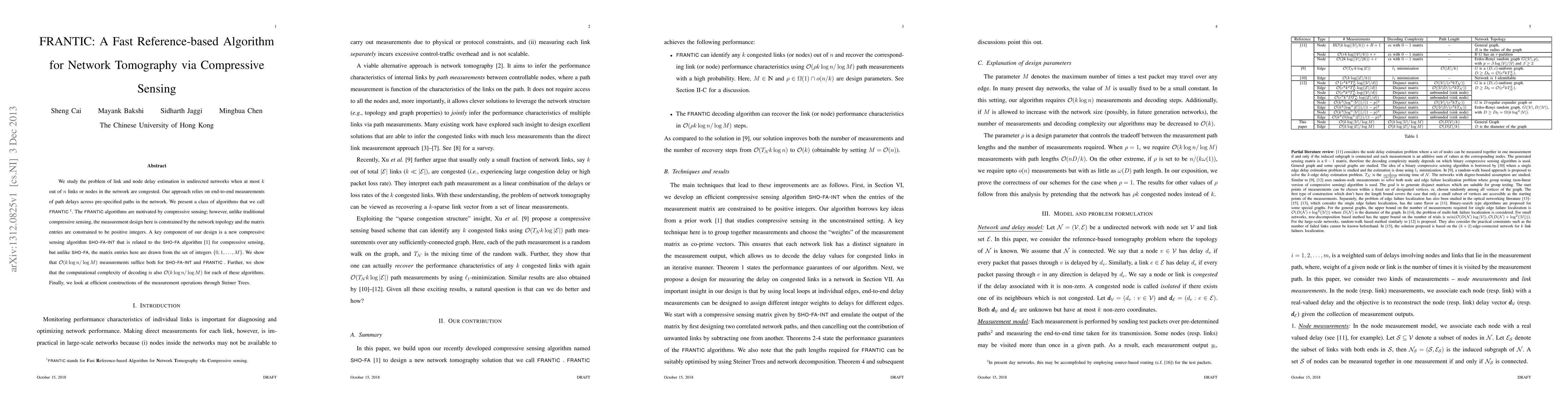 This research paper introduces a new algorithm called FRANTIC for estimating link and node delays in undirected networks with limited congested links or nodes, requiring only O(k log n /log M) measurements to achieve accurate estimates.
