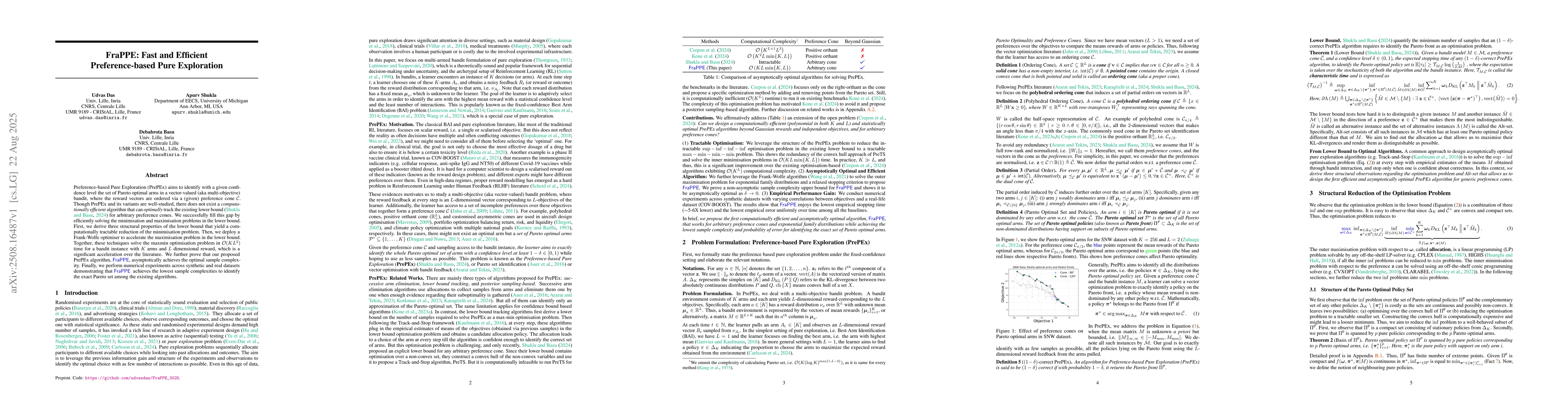 Preference-based Pure Exploration (PrePEx) aims to identify with a given confidence level the set of Pareto optimal arms in a vector-valued (aka multi-objective) bandit, where the reward vectors are ordered via a (given) preference cone $\mathcal{C}$. Though PrePEx and its variants are well-studied, there does not exist a computationally efficient algorithm that can optimally track the existing lower bound for arbitrary preference cones. We successfully fill this gap by efficiently solving the minimisation and maximisation problems in the lower bound. First, we derive three structural properties of the lower bound that yield a computationally tractable reduction of the minimisation problem. Then, we deploy a Frank-Wolfe optimiser to accelerate the maximisation problem in the lower bound. Together, these techniques solve the maxmin optimisation problem in $\mathcal{O}(KL^{2})$ time for a bandit instance with $K$ arms and $L$ dimensional reward, which is a significant acceleration over the literature. We further prove that our proposed PrePEx algorithm, FraPPE, asymptotically achieves the optimal sample complexity. Finally, we perform numerical experiments across synthetic and real datasets demonstrating that FraPPE achieves the lowest sample complexities to identify the exact Pareto set among the existing algorithms.