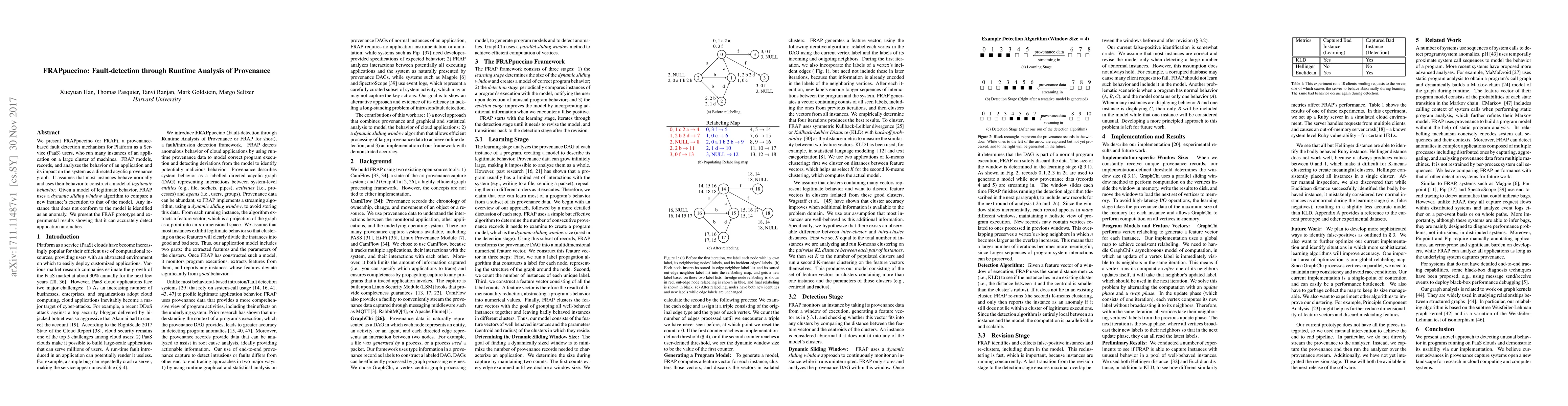 FRAPpuccino (FRAP) is a provenance-based fault detection system for PaaS users, modeling application behavior and identifying anomalies through a directed acyclic provenance graph. Experimental results demonstrate its efficacy in accurately detecting application anomalies.
