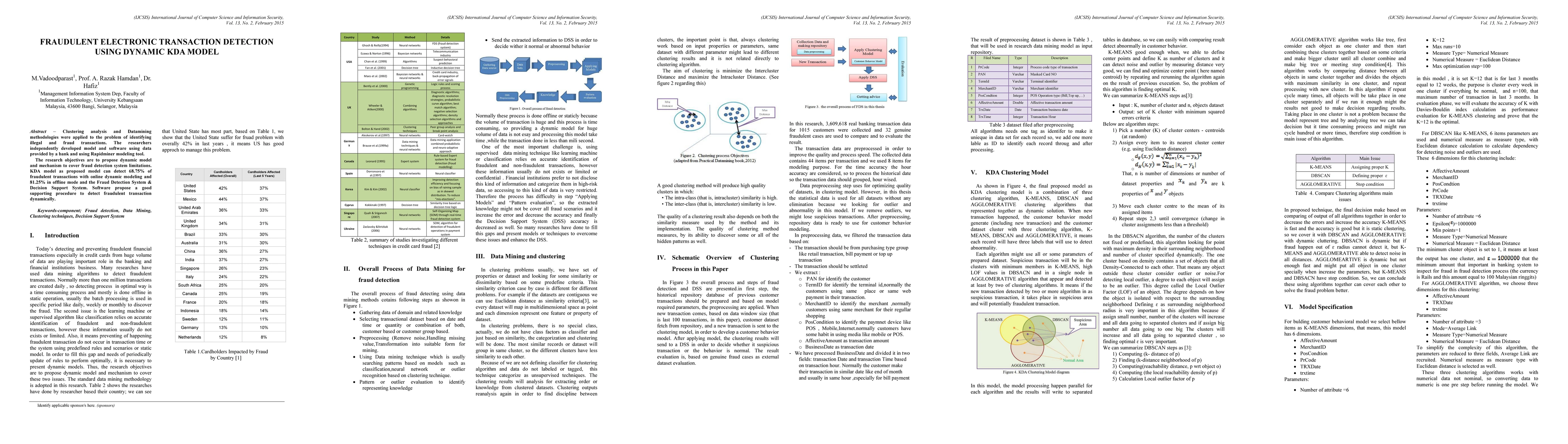 Clustering analysis and Datamining methodologies were applied to the problem of identifying illegal and fraud transactions. The researchers independently developed model and software using data provided by a bank and using Rapidminer modeling tool. The research objectives are to propose dynamic model and mechanism to cover fraud detection system limitations. KDA model as proposed model can detect 68.75% of fraudulent transactions with online dynamic modeling and 81.25% in offline mode and the Fraud Detection System & Decision Support System. Software propose a good supporting procedure to detect fraudulent transaction dynamically.