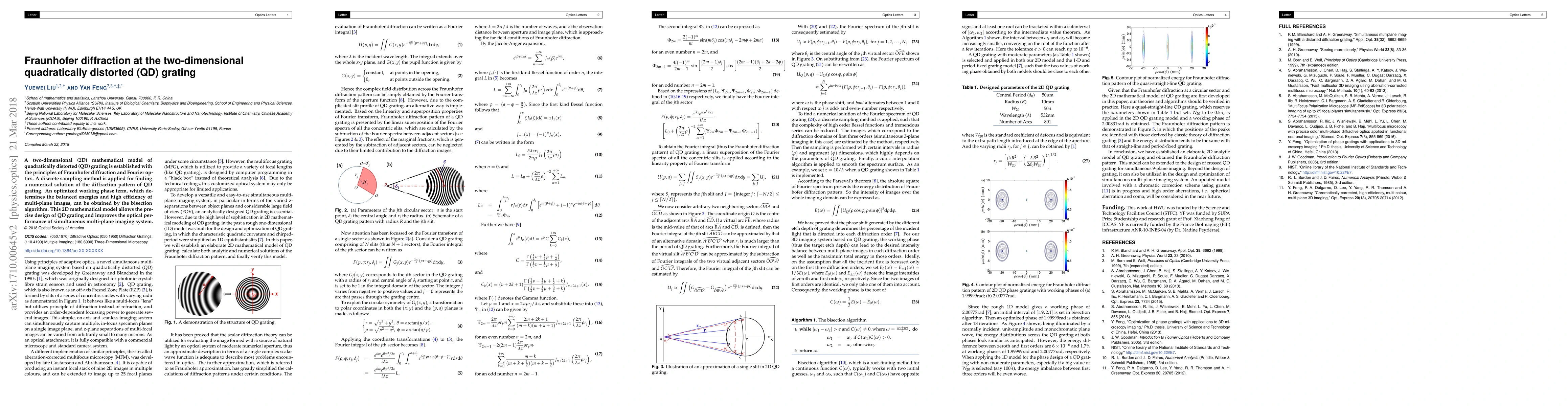 This paper establishes a 2D mathematical model for quadratically distorted gratings using Fraunhofer diffraction and Fourier optics, employing discrete sampling and bisection algorithms to find the diffraction pattern. The model enhances the design and optical performance of multiplane imaging systems.