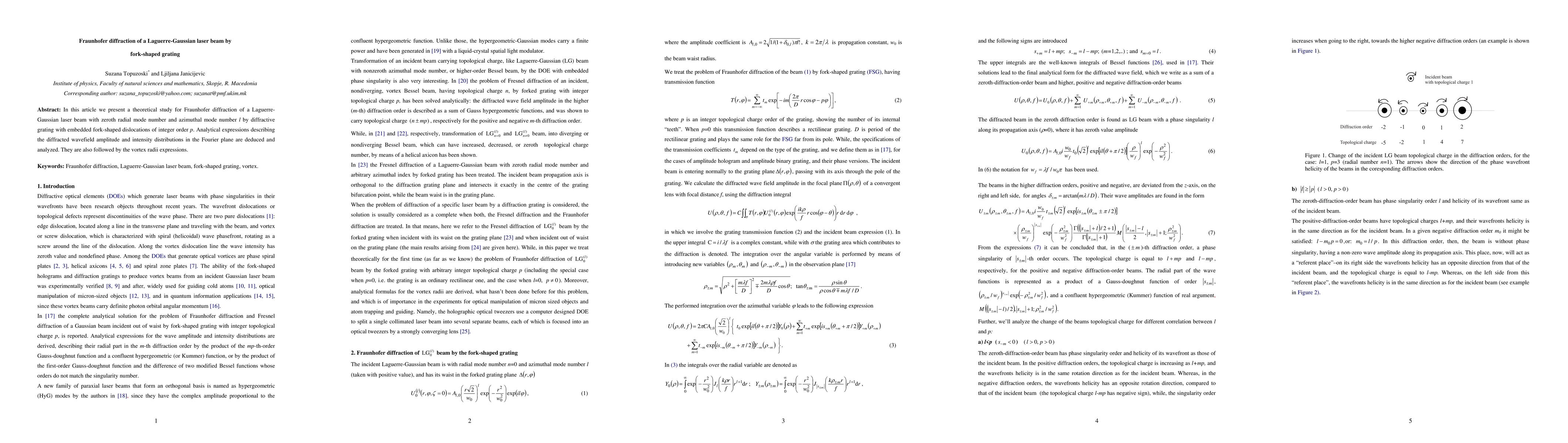 The paper provides a comprehensive theoretical analysis of Fraunhofer diffraction of Laguerre-Gaussian beams by fork-shaped gratings, deriving analytical expressions for wave field amplitude, intensity distributions, and vortex radii.