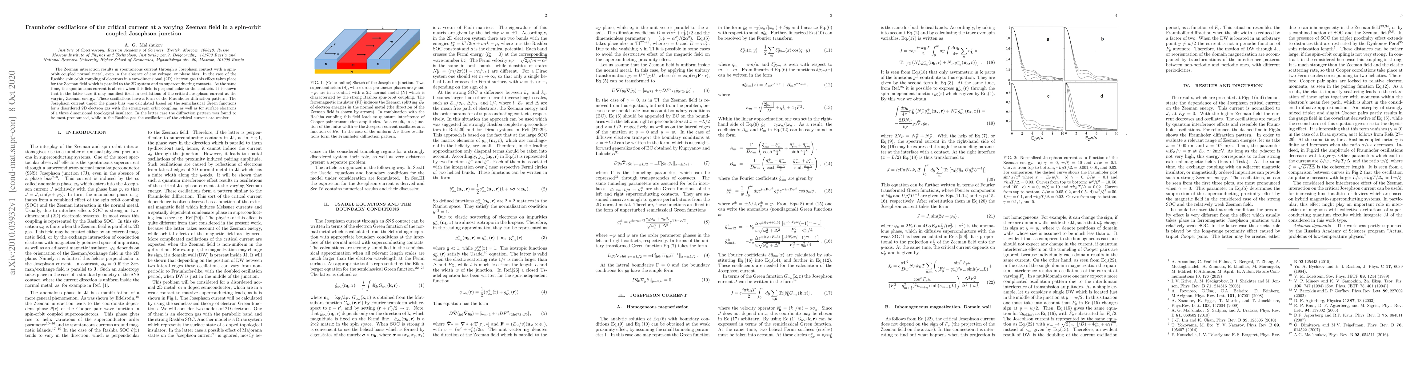 The Zeeman interaction results in spontaneous current through a Josephson contact with a spin-orbit coupled normal metal, even in the absence of any voltage, or phase bias. In the case of the Rashba spin orbit coupling of electrons in a two-dimensional (2D) electron gas this effect takes place for the Zeeman field which is parallel to the 2D system and to superconducting contacts. At the same time, the spontaneous current is absent when this field is perpendicular to the contacts. It is shown that in the latter case it may manifest itself in oscillations of the critical Josephson current at the varying Zeeman energy. These oscillations have a form of the Fraunhofer diffraction pattern. The Josephson current under the phase bias was calculated based on the semiclassical Green functions for a disordered 2D electron gas with the strong spin orbit coupling, as well as for surface electrons of a three dimensional topological insulator. In the latter case the diffraction pattern was found to be most pronounced, while in the Rashba gas the oscillations of the critical current are weaker.