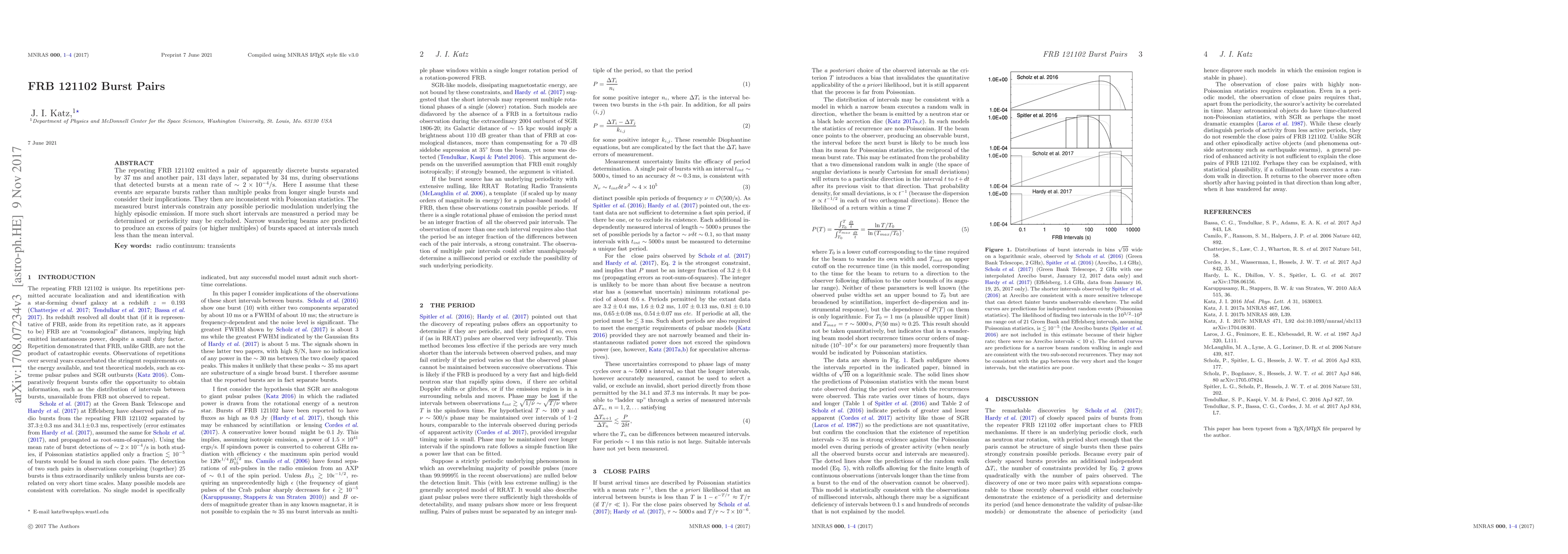 The repeating FRB 121102 emitted a pair of discrete bursts separated by 37 ms and another pair, 131 days later, separated by 34 ms, during observations that detected FRB at a mean rate of $2 \times 10^{-4}$/s. Here I assume that these events are separate bursts rather than multiple peaks from longer single bursts and consider their implications. They then are inconsistent with Poissonian statistics. The measured intervals constrain any possible periodic modulation underlying the highly episodic emission. If more such short intervals are measured a period may be determined or periodicity may be excluded. Sources of narrow wandering beams predict pairs (or higher multiples) of bursts closely spaced in time compared to the mean event rate.