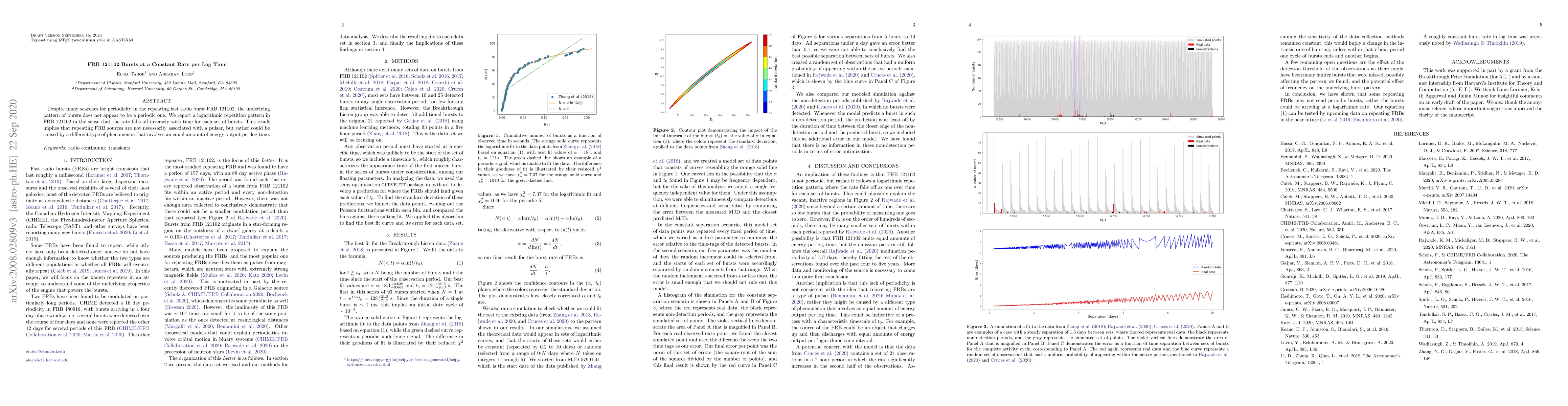 Summary: FRB 121102 exhibits a non-periodic logarithmic repetition pattern, suggesting its bursts occur at a constant rate per log time, indicating a different mechanism than pulsar activity for its energy output.
