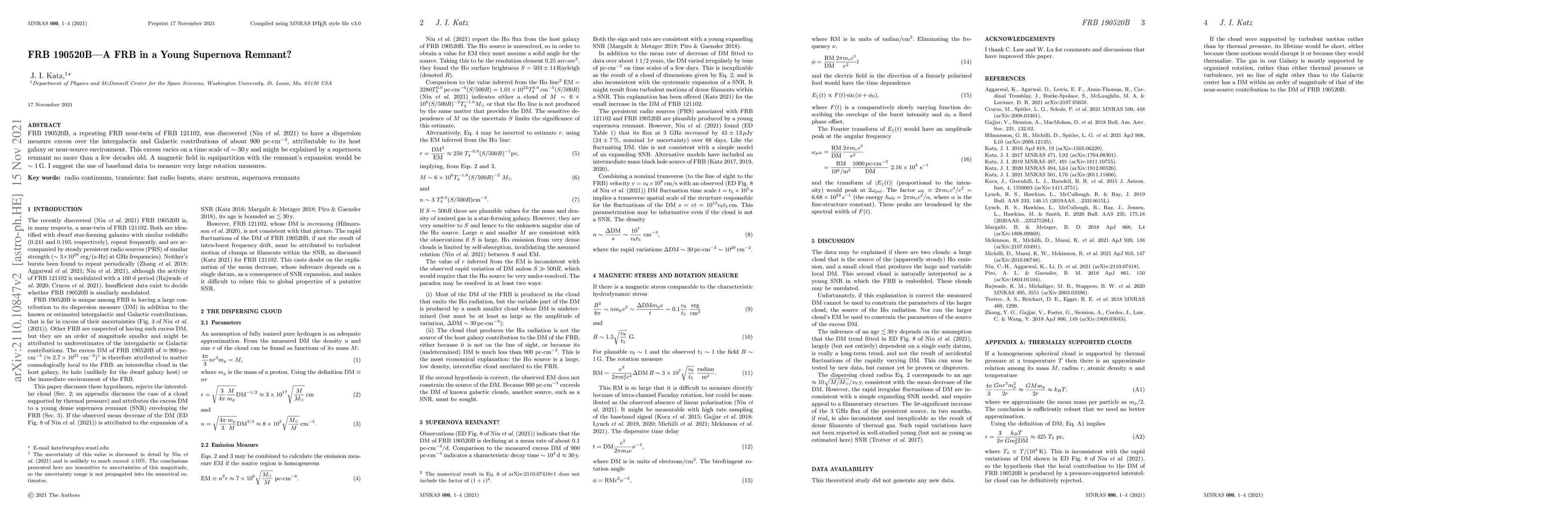 FRB 190520B, a repeating FRB near-twin of FRB 121102, was discovered \citep{N21} to have a dispersion measure excess over the intergalactic and Galactic contributions of about 900 pc-cm$^{-3}$, attributable to its host galaxy or near-source environment. This excess varies on a time scale of $\sim 30\,$y and might be explained by a supernova remnant no more than a few decades old. A magnetic field in equipartition with the remnant's expansion would be ${\cal O}(1\,\text{G})$. I suggest the use of baseband data to measure very large rotation measures.