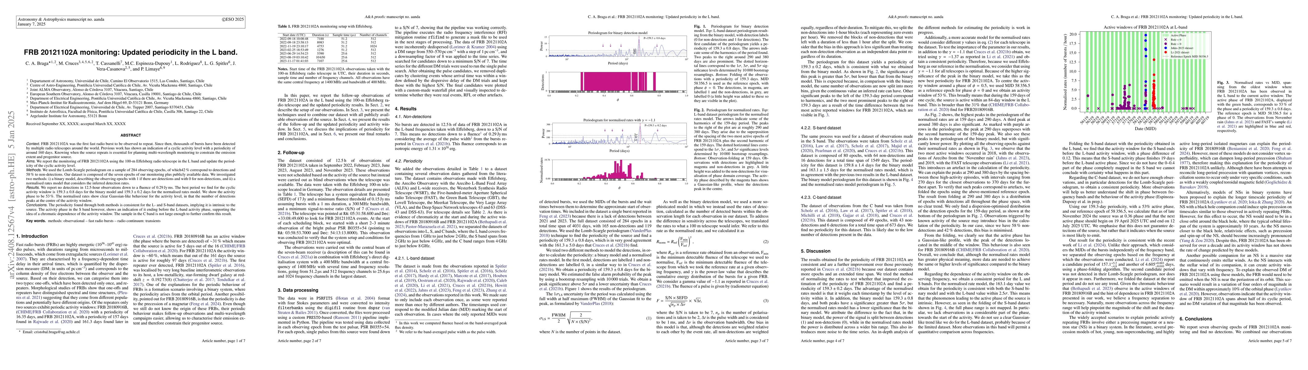 This research updates the periodicity of the repeating fast radio burst FRB 20121102A, monitored at L-band with the Effelsberg telescope. Using two detection models, the best-fit periodicity is determined to be $159.3 \pm 0.8$ days, consistent across L and S-band datasets, indicating intrinsic source behavior, though S-band activity may end earlier than L-band activity, suggesting chromatic dependence.