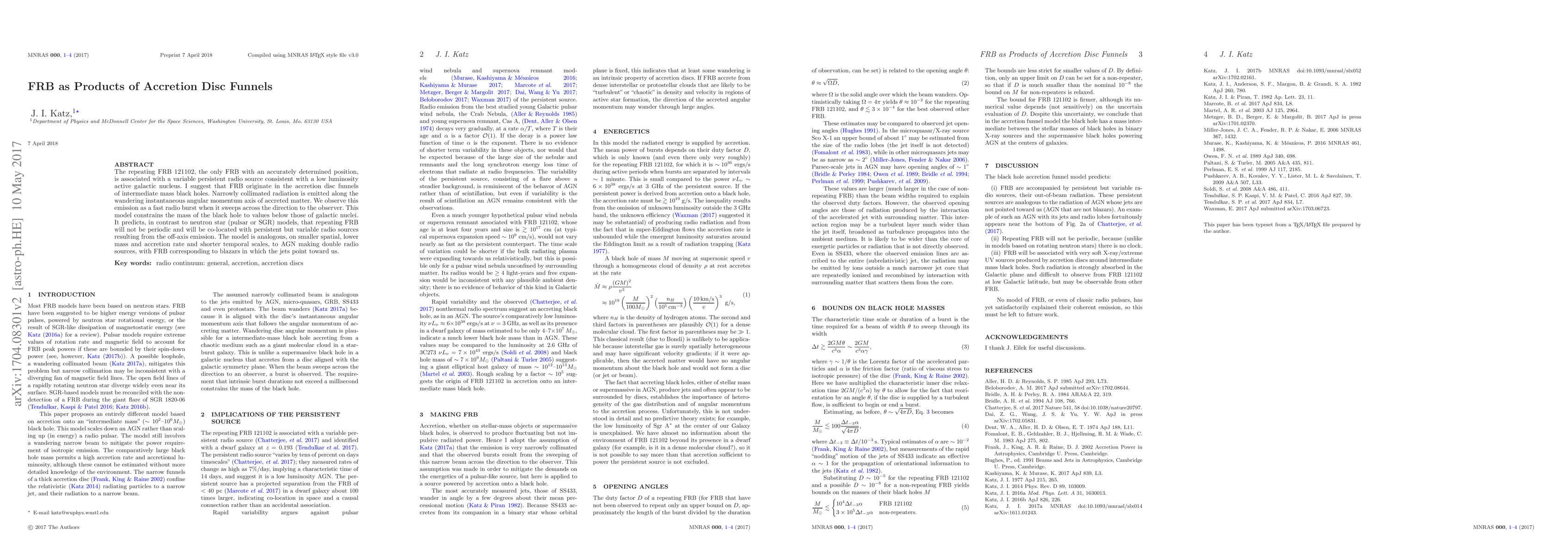 The paper proposes that Fast Radio Bursts (FRB 121102) originate from accretion disc funnels of intermediate mass black holes. This model suggests non-periodic, repeating FRBs co-located with variable radio sources, contrasting with neutron star models. It draws an analogy to Active Galactic Nuclei (AGN) processes on smaller scales.