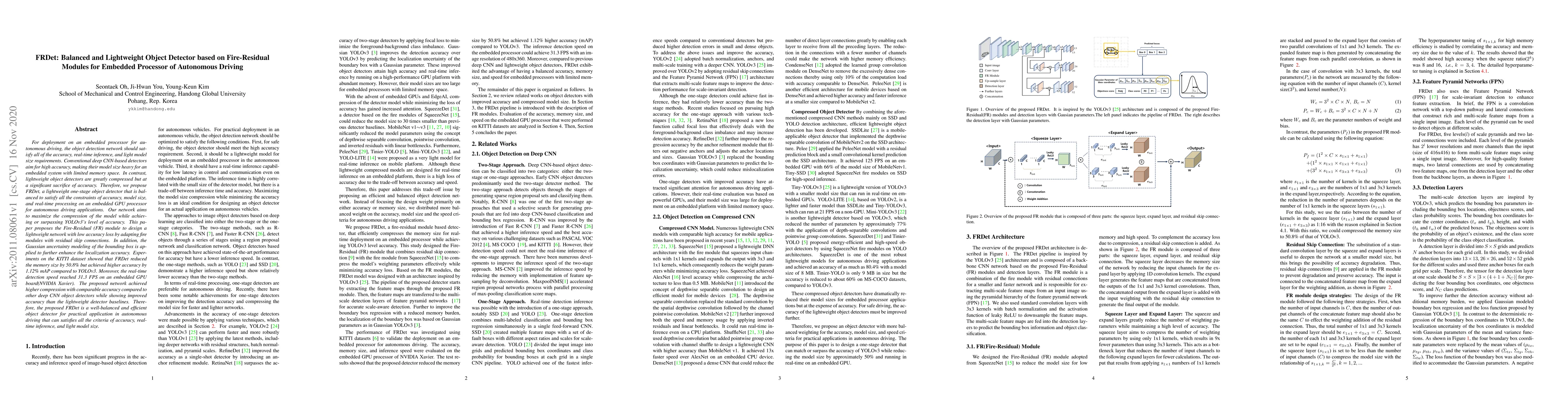 FRDet is a balanced and lightweight one-stage object detector designed for embedded processors in autonomous driving, utilizing Fire-Residual modules and Gaussian uncertainty modeling to achieve high accuracy while significantly reducing model size and maintaining real-time processing speeds. Experiments on the KITTI dataset demonstrated a 50.8% reduction in memory size and a 1.12% improvement in accuracy compared to YOLOv3.