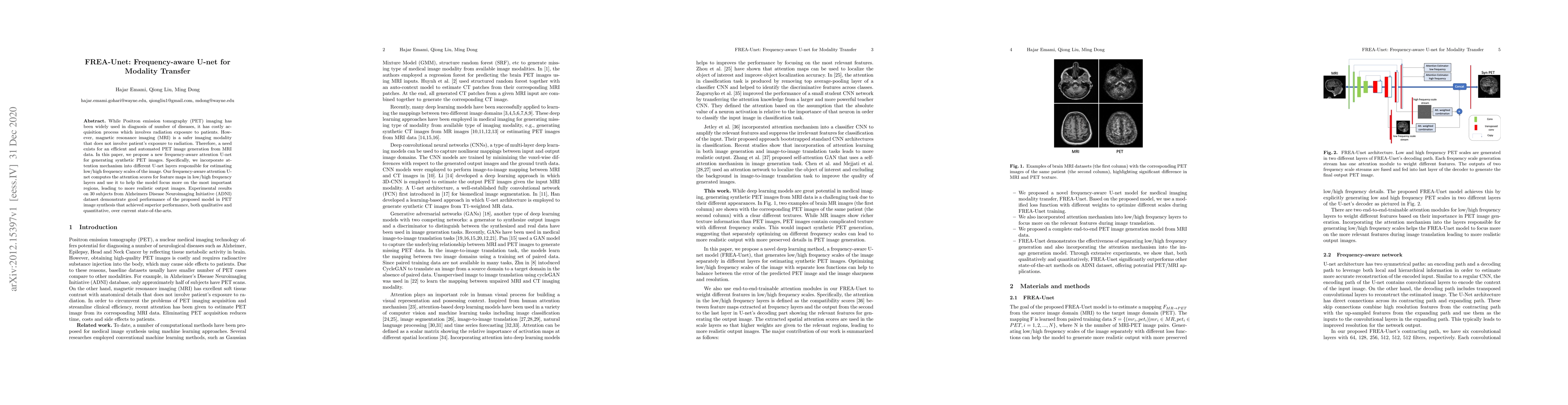 This paper proposes a frequency-aware attention U-net for generating synthetic PET images from MRI data, aiming to reduce radiation exposure. The model incorporates attention mechanisms to focus on important regions, achieving superior performance in both qualitative and quantitative metrics compared to existing methods.