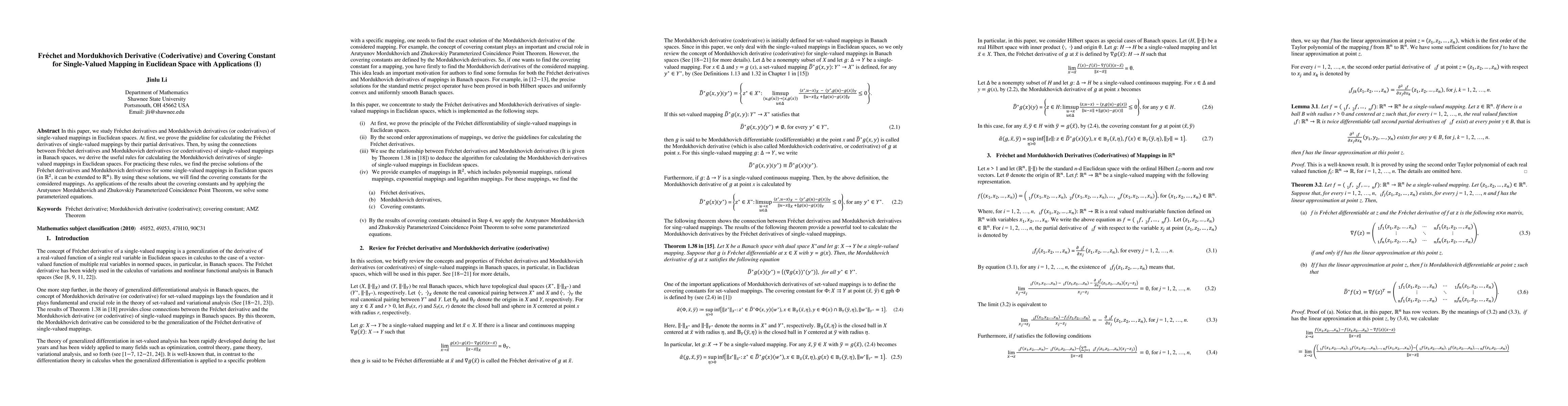 In this paper, we study Frechet derivatives and Mordukhovich derivatives (or coderivatives) of single-valued mappings in Euclidean spaces. At first, we prove the guideline for calculating the Frechet derivatives of single-valued mappings by their partial derivatives. Then, by using the connections between Frechet derivatives and Mordukhovich derivatives (or coderivatives) of single-valued mappings in Banach spaces, we derive the useful rules for calculating the Mordukhovich derivatives of single-valued mappings in Euclidean spaces. For practicing these rules, we find the precise solutions of the Frechet derivatives and Mordukhovich derivatives for some single-valued mappings in Euclidean spaces (in R^2, it can be extended to R^n). By using these solutions, we will find the covering constants for the considered mappings. As applications of the results about the covering constants and by applying the Arutyunov Mordukhovich and Zhukovskiy Parameterized Coincidence Point Theorem, we solve some parameterized equations.