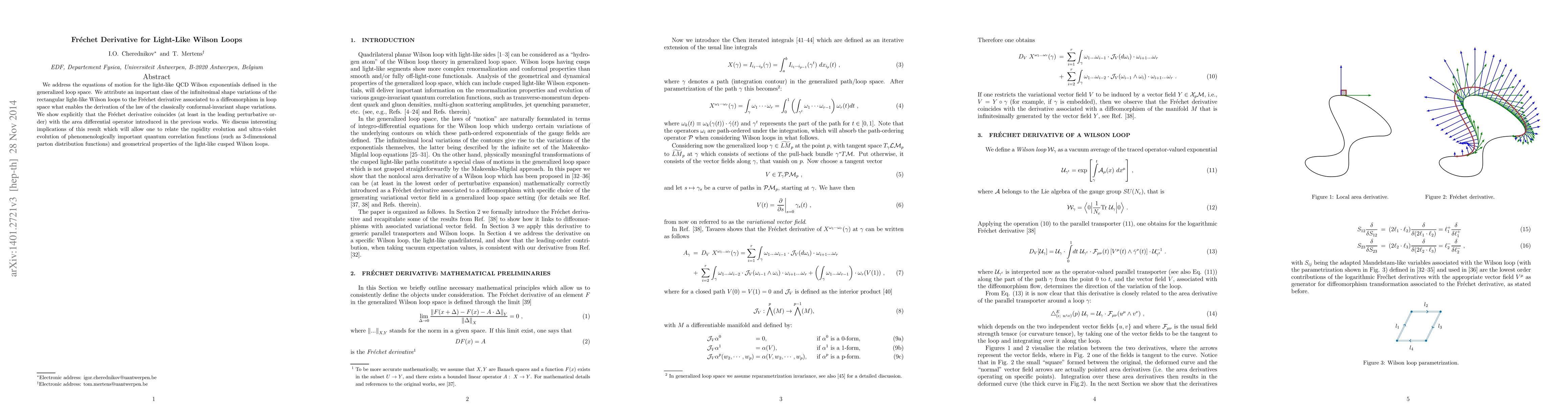 We address the equations of motion for the light-like QCD Wilson exponentials defined in the generalized loop space. We attribute an important class of the infinitesimal shape variations of the rectangular light-like Wilson loops to the Fr\'echet derivative associated to a diffeomorphism in loop space what enables the derivation of the law of the classically conformal-invariant shape variations. We show explicitly that the Fr\'echet derivative coincides (at least in the leading perturbative or- der) with the area differential operator introduced in the previous works. We discuss interesting implications of this result which will allow one to relate the rapidity evolution and ultra-violet evolution of phenomenologically important quantum correlation functions (such as 3-dimensional parton distribution functions) and geometrical properties of the light-like cusped Wilson loops.