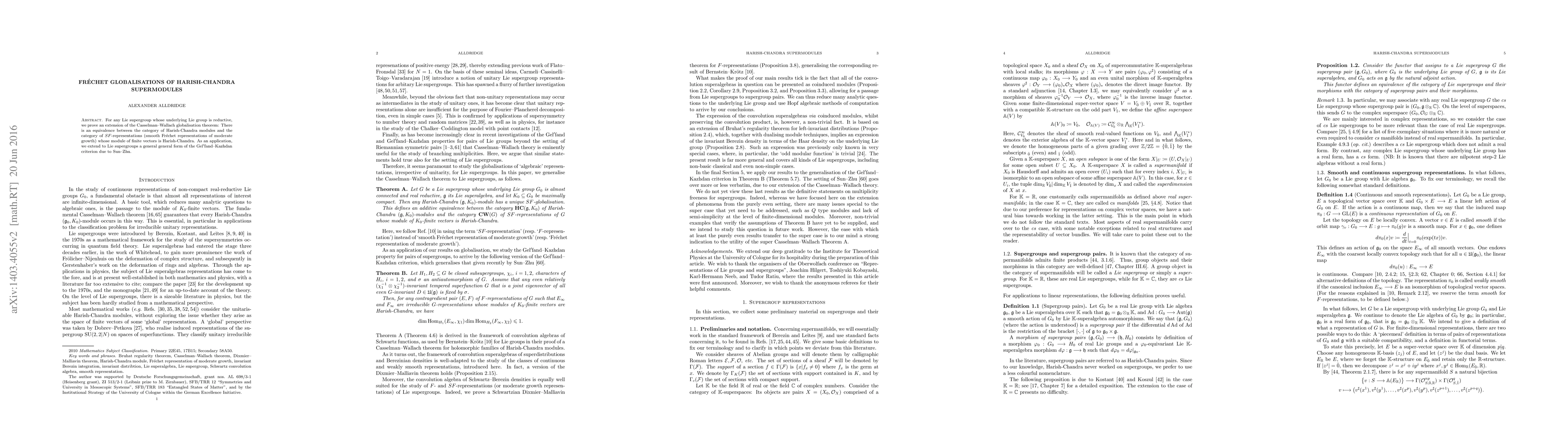 This paper extends the Casselman-Wallach globalisation theorem to Lie supergroups, showing an equivalence between Harish-Chandra modules and SF-representations with specific growth conditions. The authors also apply this to extend the Gel'fand-Kazhdan criterion to the supergroup setting.