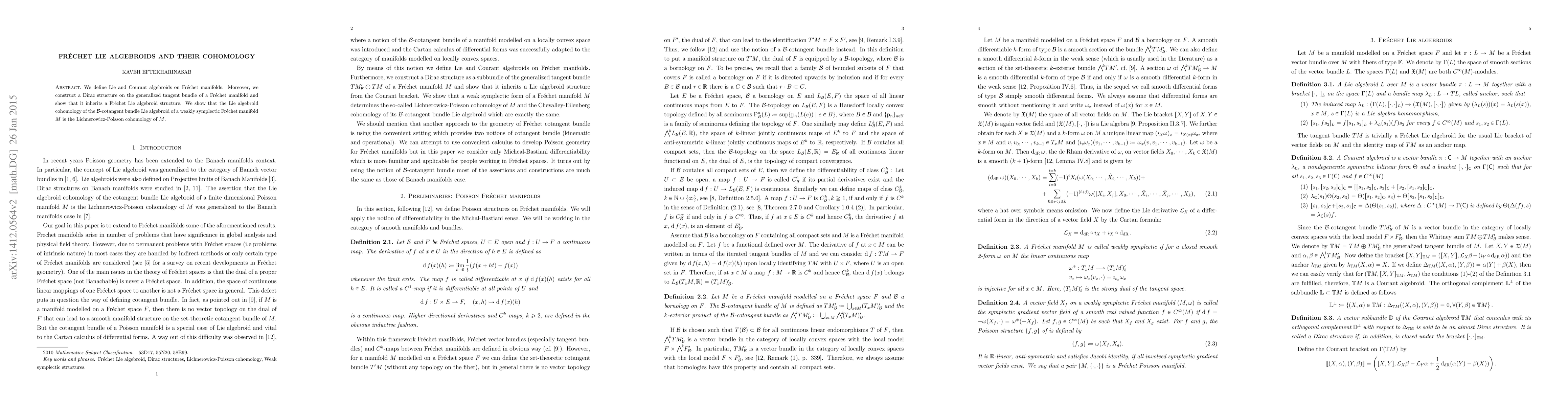 This paper defines Lie and Courant algebroids on Fréchet manifolds and constructs a Fréchet Lie algebroid structure on the Dirac structure of the generalized tangent bundle. It demonstrates that the Lie algebroid cohomology of the cotangent bundle Lie algebroid on a weakly symplectic Fréchet manifold corresponds to the Lichnerowicz-Poisson cohomology of the manifold.