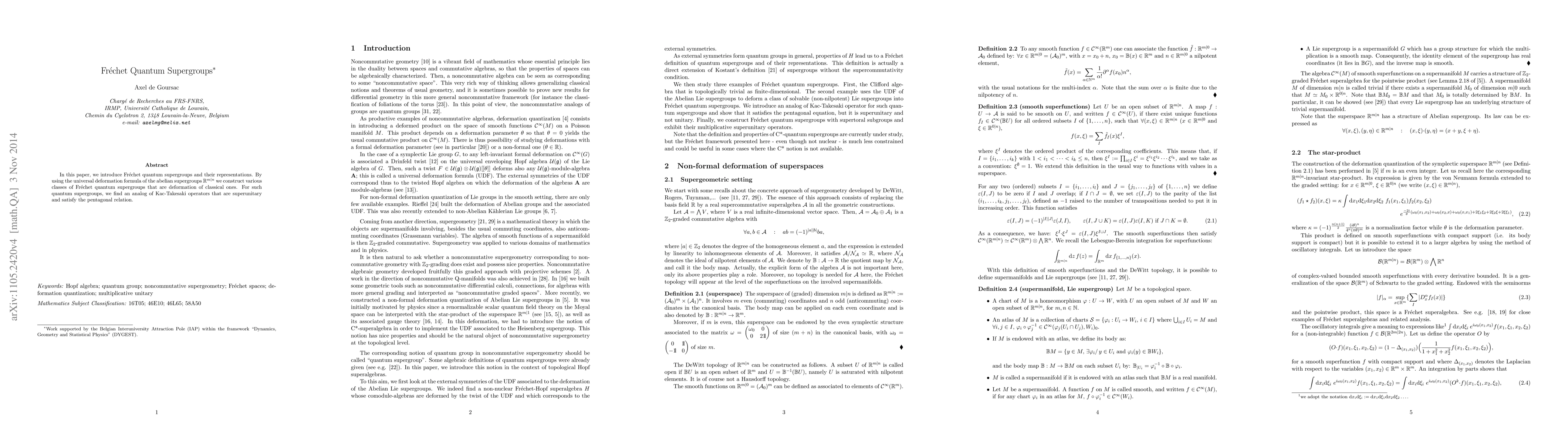 This paper introduces Fr\'echet quantum supergroups, constructing them via the universal deformation formula of abelian supergroups, and identifies their representations through superunitary Kac-Takesaki analogs that adhere to the pentagonal relation.