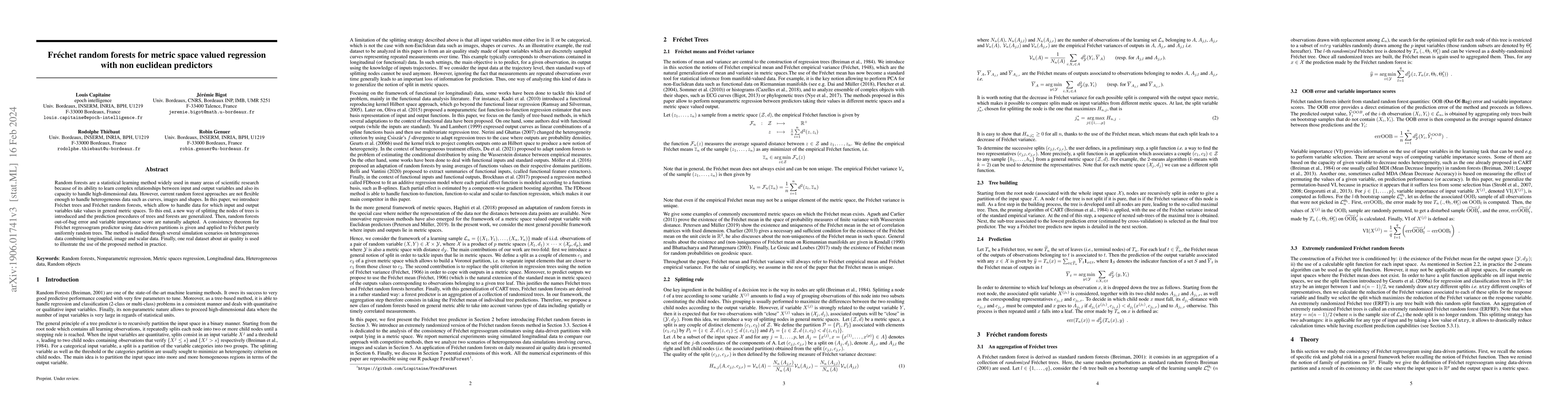 This paper introduces Fr\'echet random forests to handle metric space valued regression with non-Euclidean predictors, extending traditional random forests to accommodate complex, heterogeneous data types. The method includes a novel node-splitting technique and adapted prediction procedures, and is demonstrated through simulations and a real-world air quality dataset.