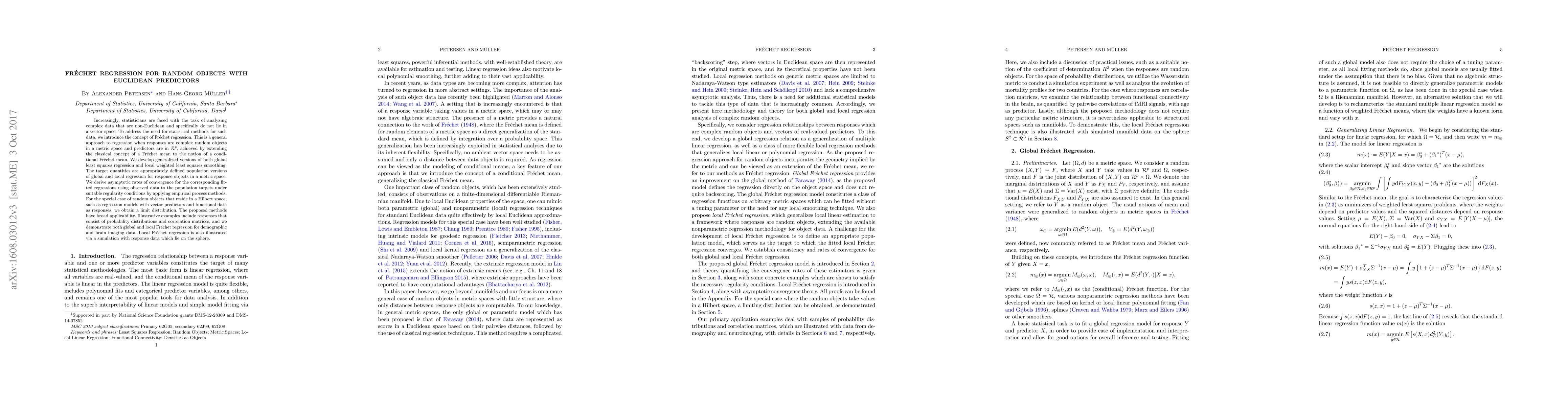 This paper introduces Fr\'echet regression for analyzing complex non-Euclidean data where responses are random objects in a metric space and predictors are Euclidean. It extends classical Fr\'echet mean concepts and develops generalized regression methods, providing asymptotic convergence rates and limit distributions for specific cases.