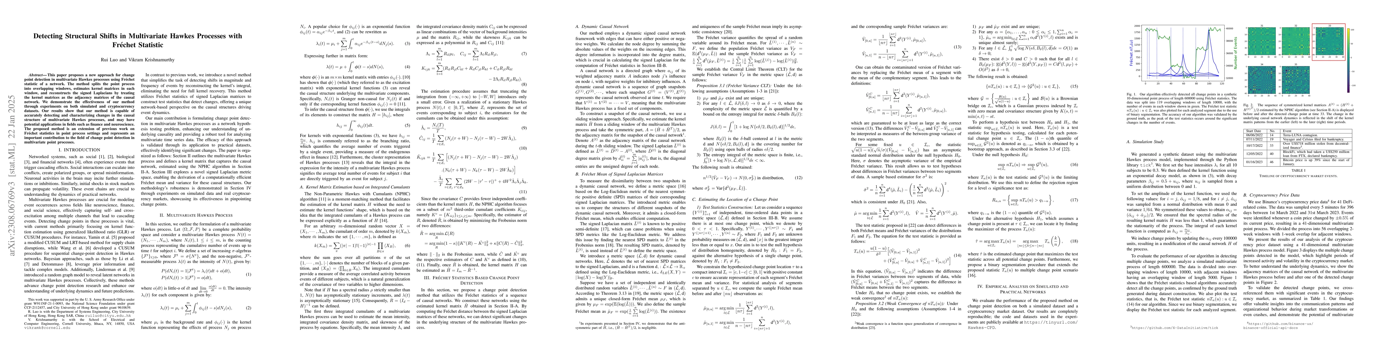 This paper introduces a novel method for detecting change points in multivariate Hawkes processes using Fréchet statistics, which splits the process into overlapping windows, estimates kernel matrices, and reconstructs signed Laplacians. Experiments on cryptocurrency datasets show its effectiveness in accurately identifying changes in causal networks, with potential applications in finance and neuroscience.