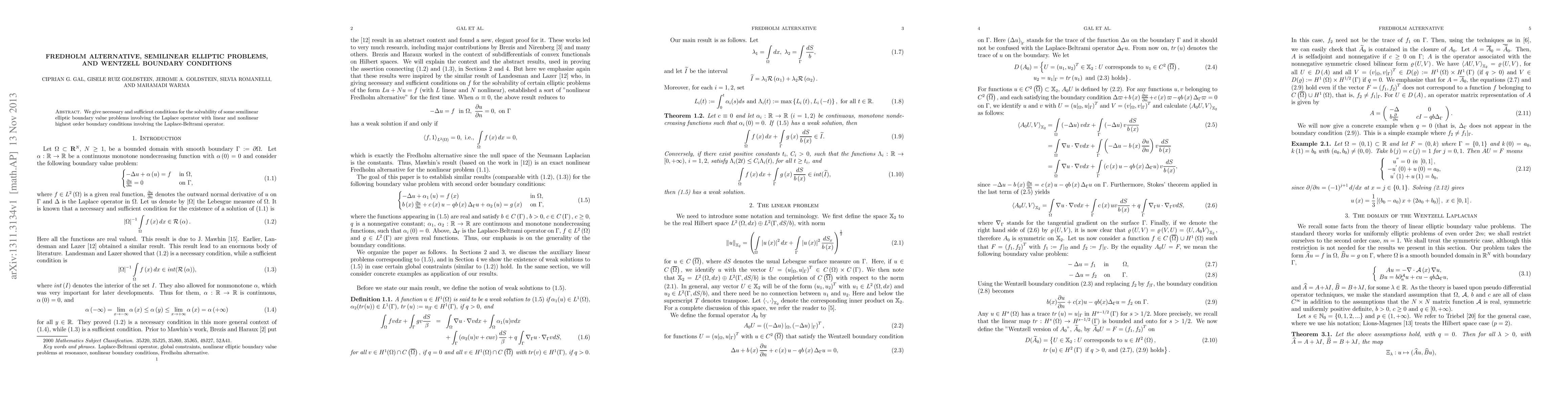 Summary: This paper provides necessary and sufficient conditions for the solvability of semilinear elliptic boundary value problems with Wentzell boundary conditions, focusing on the interplay between the Laplace operator and the Laplace-Beltrami operator. The Fredholm alternative is utilized to establish these conditions.