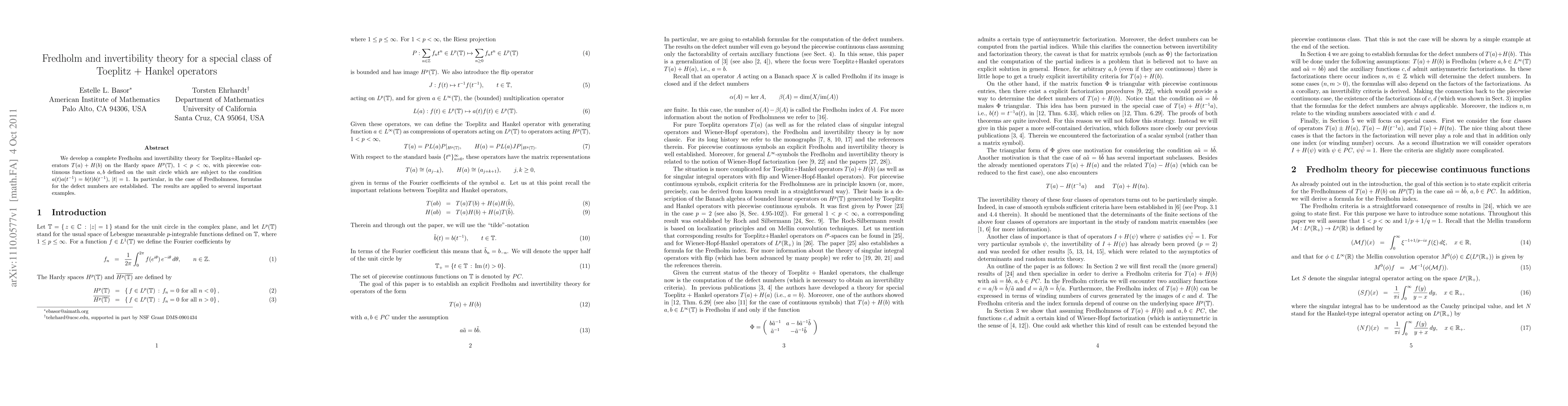 We develop a complete Fredholm and invertibility theory for Toeplitz+Hankel operators $T(a)+H(b)$ on the Hardy space $H^p$, $1