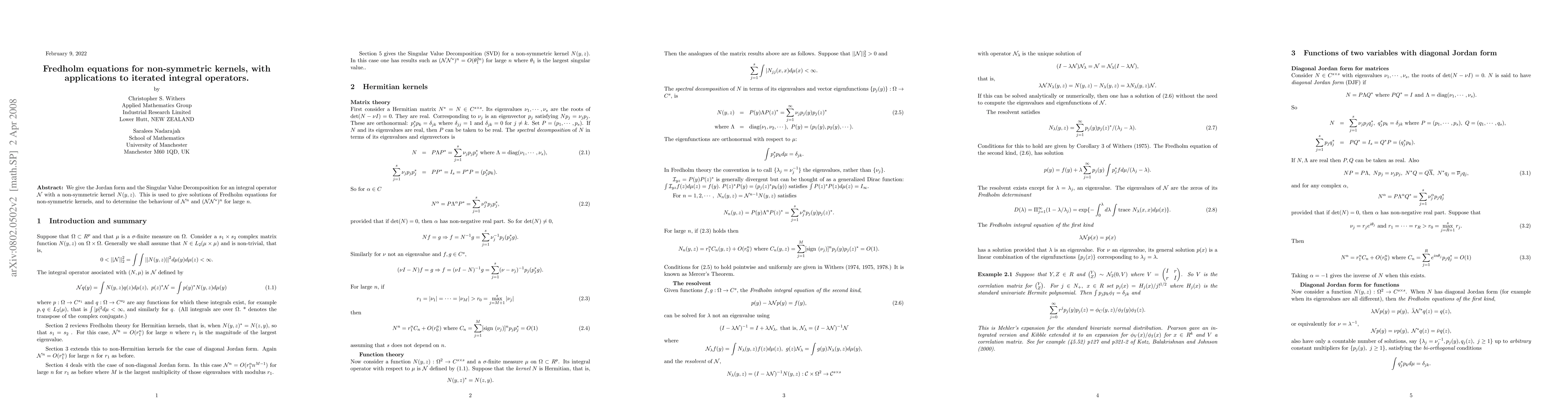 We give the Jordan form and the Singular Value Decomposition for an integral operator ${\cal N}$ with a non-symmetric kernel $N(y,z)$. This is used to give solutions of Fredholm equations for non-symmetric kernels, and to determine the behaviour of ${\cal N}^n$ and $({\cal N}{\cal N^*})^n$ for large $n$.