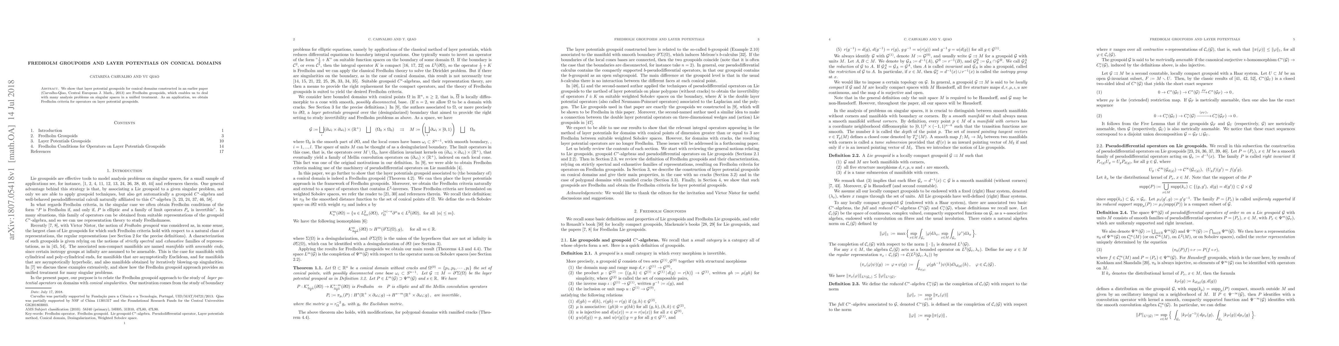 We show that layer potential groupoids for conical domains constructed in an earlier paper (Carvalho-Qiao, Central European J. Math., 2013) are Fredholm groupoids, which enables us to deal with many analysis problems on singular spaces in a unified treatment. As an application, we obtain Fredholm criteria for operators on layer potential groupoids.