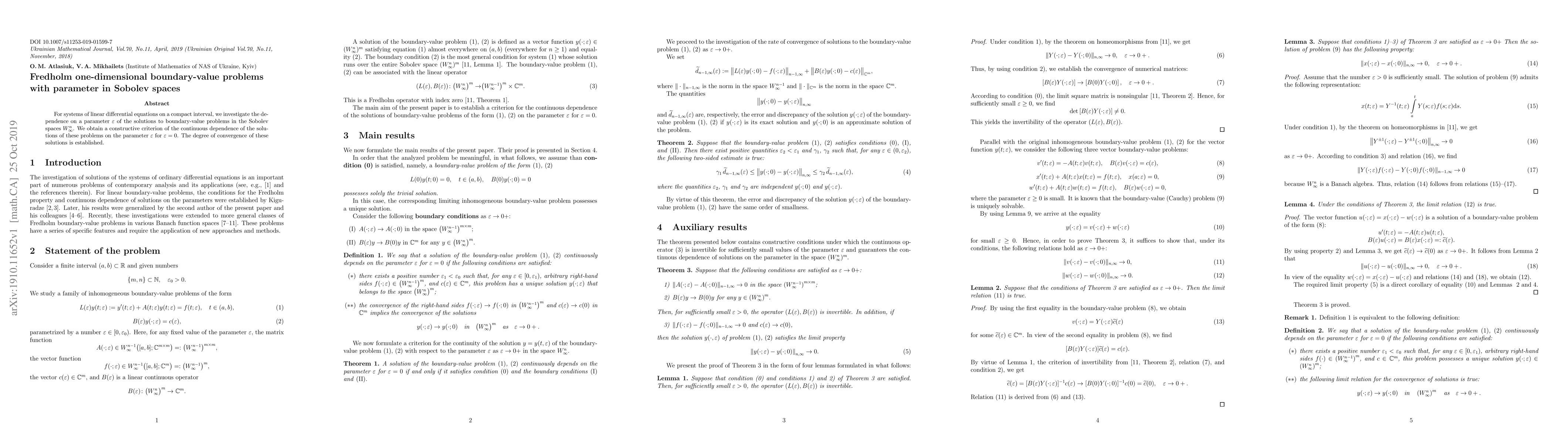 This paper investigates the dependence on a parameter $\varepsilon$ of solutions to linear differential equations' boundary-value problems in Sobolev spaces $W^{n}_{\infty}$. It provides a constructive criterion for the continuous dependence of solutions on $\varepsilon$ when $\varepsilon=0$ and establishes the degree of convergence of these solutions.