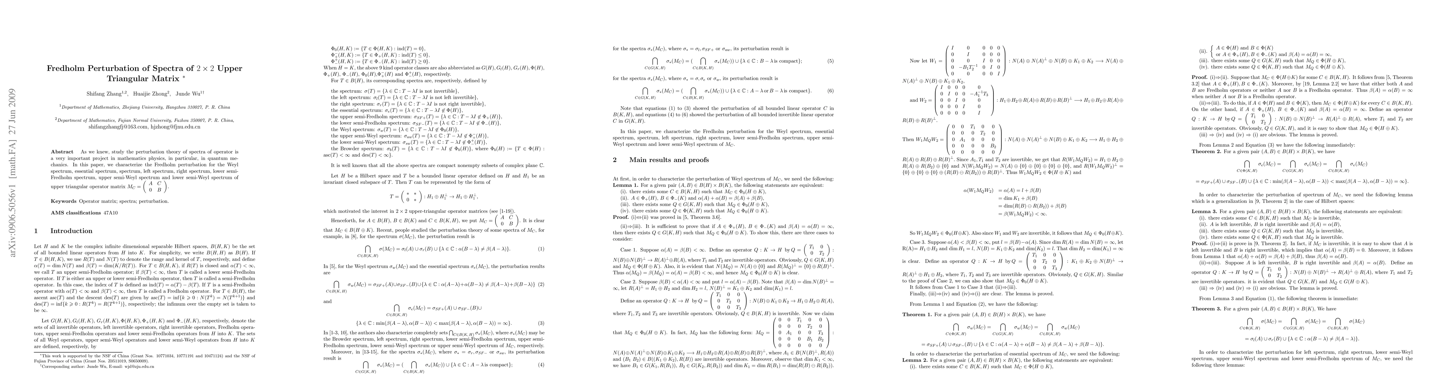 As we knew, study the perturbation theory of spectra of operator is a very important project in mathematics physics, in particular, in quantum mechanics. In this paper, we characterize the Fredholm perturbation for the Weyl spectrum, essential spectrum, spectrum, left spectrum, right spectrum, lower semi-Fredholm spectrum, upper semi-Weyl spectrum and lower semi-Weyl spectrum of upper triangular operator matrix $M_{C}=({cc} A&C 0&B)$.