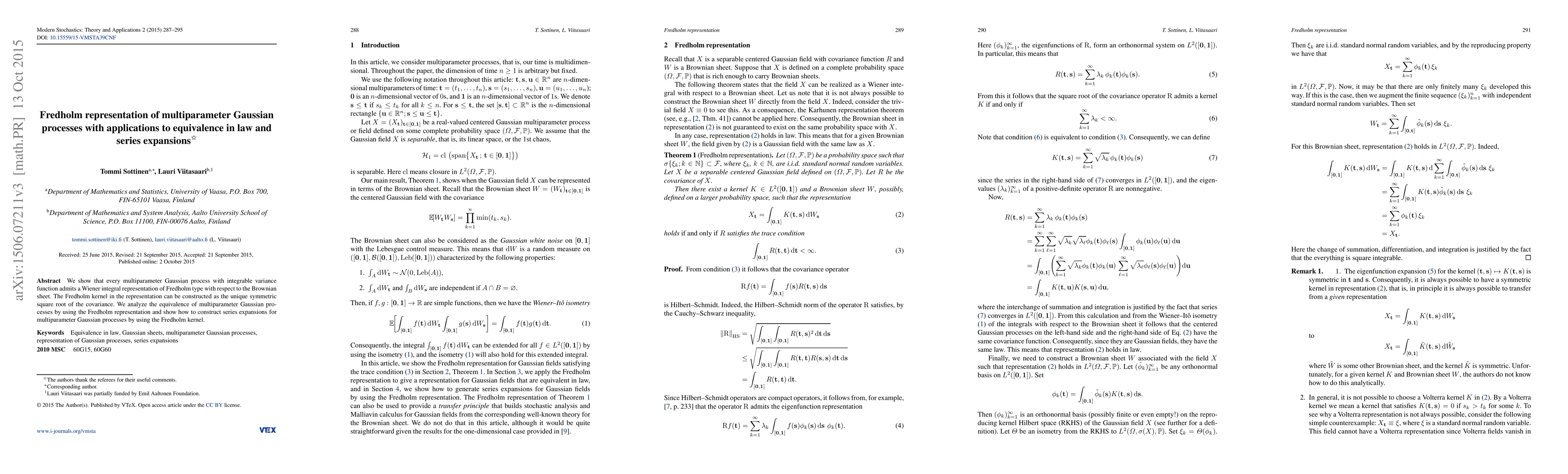 This paper demonstrates a Fredholm representation of multiparameter Gaussian processes via Wiener integrals with respect to the Brownian sheet, utilizing the unique symmetric square root of the covariance kernel. It also explores equivalence in law and constructs series expansions for these processes using the Fredholm kernel.