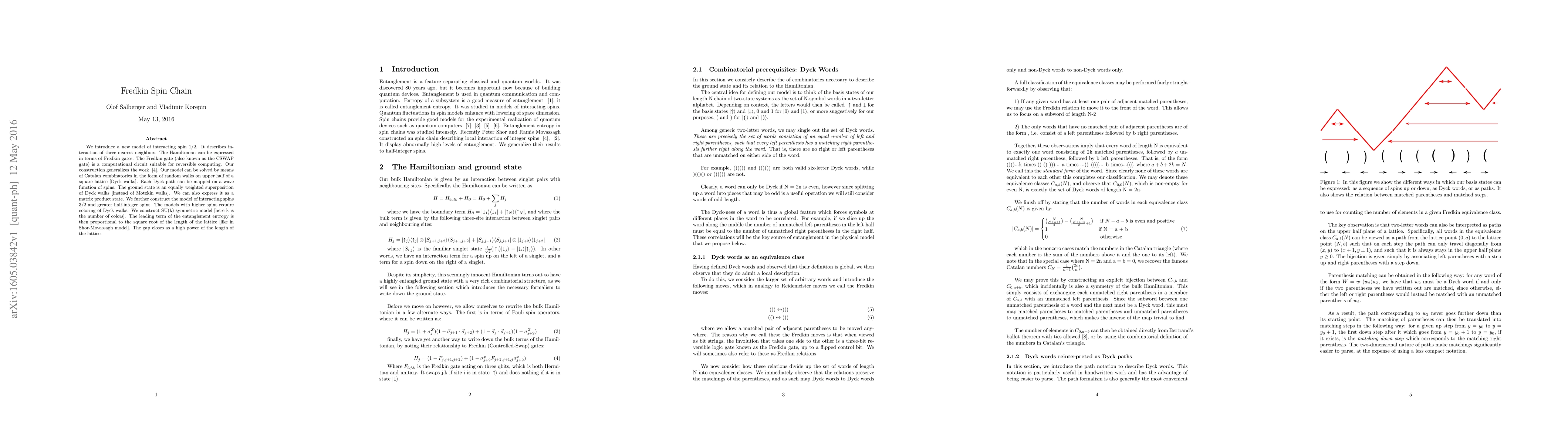 We introduce a new model of interacting spin 1/2. It describes interaction of three nearest neighbors. The Hamiltonian can be expressed in terms of Fredkin gates. The Fredkin gate (also known as the CSWAP gate) is a computational circuit suitable for reversible computing. Our construction generalizes the work of Ramis Movassagh and Peter Shor. Our model can be solved by means of Catalan combinatorics in the form of random walks on the upper half of a square lattice [Dyck walks]. Each Dyck path can be mapped to a wave function of the spins. The ground state is an equally weighted superposition of Dyck walks [instead of Motzkin walks]. We can also express it as a matrix product state. We further construct the model of interacting spins 3/2 and greater half-integer spins. The models with higher spins require coloring of Dyck walks. We construct SU(k) symmetric model [here k is the number of colors]. The leading term of the entanglement entropy is then proportional to the square root of the length of the lattice [like in Shor-Movassagh model]. The gap closes as a high power of the length of the lattice.