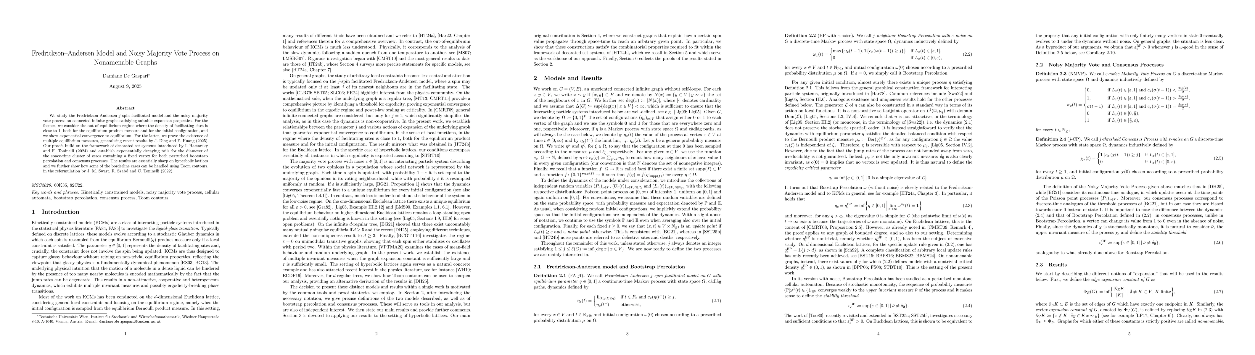 We study the Fredrickson-Andersen j-spin facilitated model and the noisy majority vote process on connected infinite graphs satisfying suitable expansion properties. For the former, we consider the out-of-equilibrium regime where the density of facilitating sites is close to 1, both for the equilibrium product measure and for the initial configuration, and we show exponential convergence to equilibrium. For the latter, we prove the existence of multiple equilibrium measures, generalising recent results by J. Ding and F. Huang (2025). Our proofs build on the framework of decorated set systems introduced by I. Hartarsky and F. Toninelli (2024) and establish exponentially decaying tails for the diameter of the space-time cluster of zeros containing a fixed vertex for both perturbed bootstrap percolation and consensus processes. The results are essentially sharp on hyperbolic lattices and we further show how some of the borderline cases can be handled using Toom contours, in the reformulation by J. M. Swart, R. Szab\'o and C. Toninelli (2022).