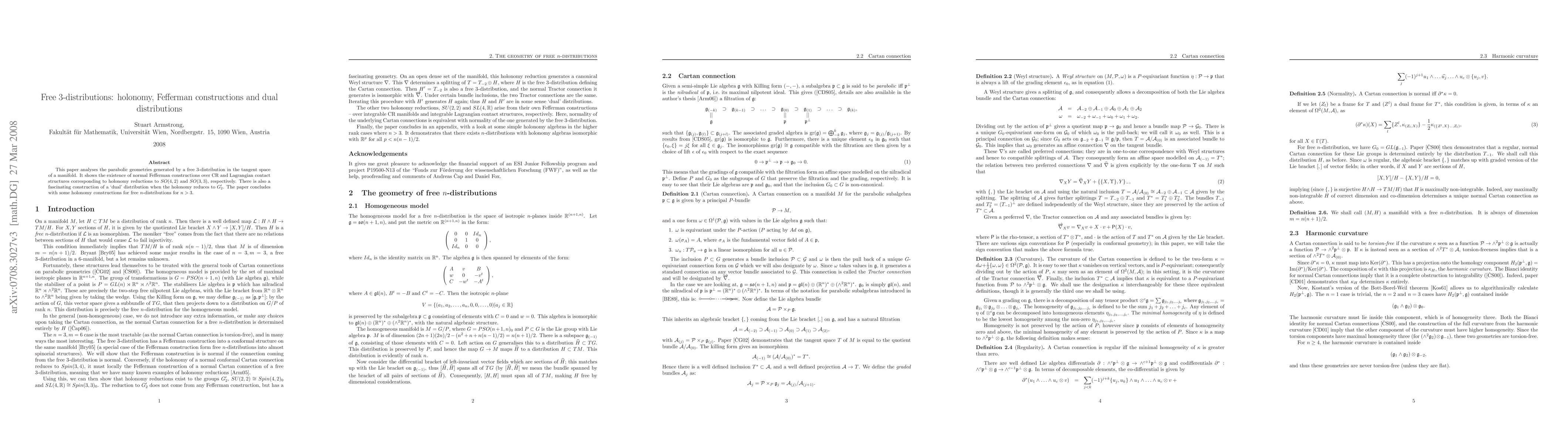 This paper analyses the parabolic geometries generated by a free 3-distribution in the tangent space of a manifold. It shows the existence of normal Fefferman constructions over CR and Lagrangian contact structures corresponding to holonomy reductions to SO(4,2) and SO(3,3), respectively. There is also a fascinating construction of a `dual' distribution when the holonomy reduces to $G_2'$. The paper concludes with some holonomy constructions for free $n$-distributions for $n>3$.