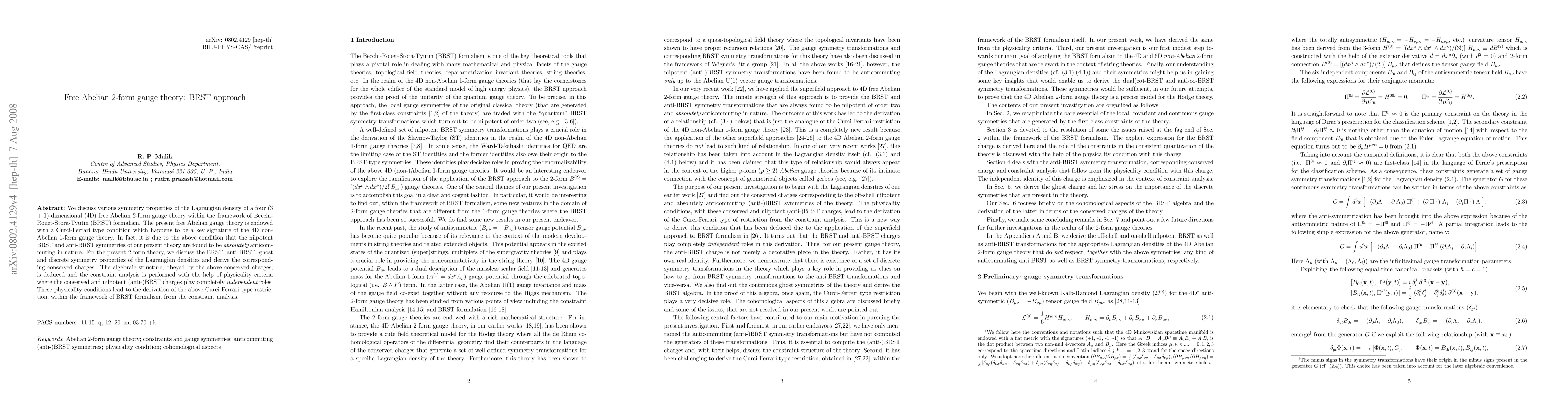 This paper explores the symmetry properties of a 4D free Abelian 2-form gauge theory using the BRST formalism, highlighting the Curci-Ferrari condition's role in establishing nilpotent, anticommuting BRST and anti-BRST symmetries. It derives conserved charges and analyzes their algebraic structure and physicality criteria.
