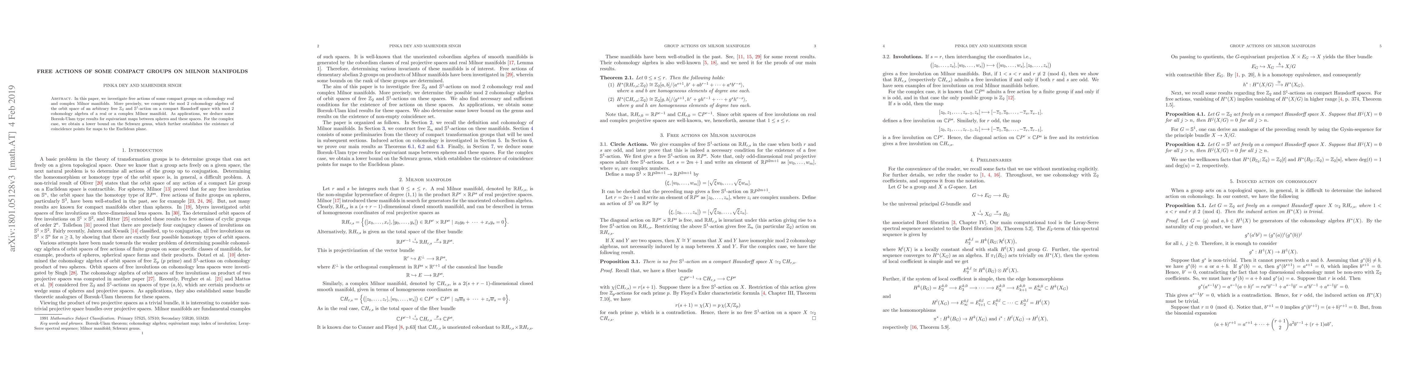 Researchers investigate free actions of compact groups on Milnor manifolds, computing cohomology algebra of orbit spaces and establishing Borsuk-Ulam type results for equivariant maps between spheres and these spaces.