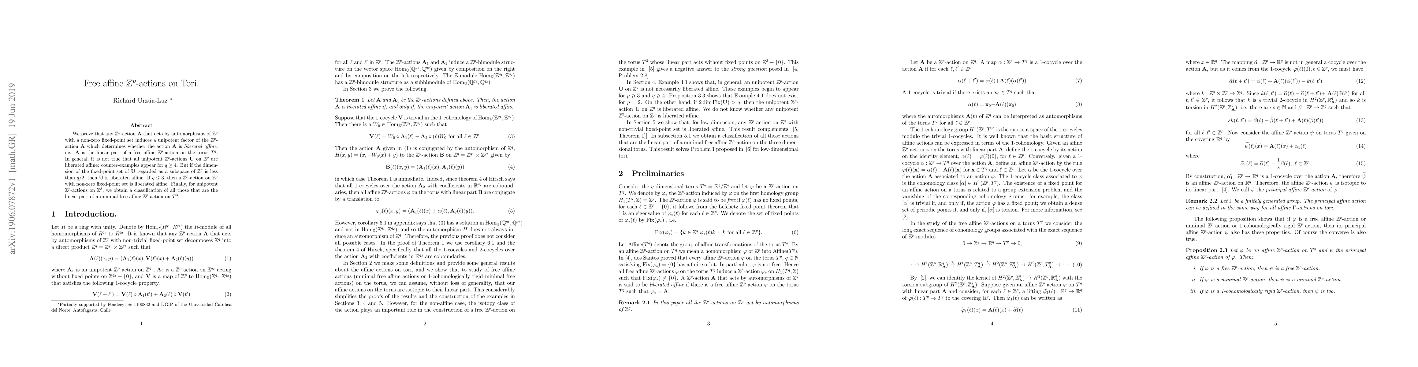 We prove that any $\mathbb{Z}^p$-action ${\bf A}$ that acts by automorphisms of $\mathbb{Z}^q$ with a non-zero fixed-point set induces a unipotent factor of the $\mathbb{Z}^p$-action ${\bf A}$ which determines whether the action ${\bf A}$ is {\it liberated affine}, i.e. ${\bf A}$ is the linear part of a free affine $\mathbb{Z}^p$-action on the torus $T^q$. In general, it is not true that all unipotent $\mathbb{Z}^p$-actions $\bf{U}$ on $\mathbb{Z}^q$ are liberated affine: counter-examples appear for $q\geq 4$. But if the dimension of the fixed-point set of ${\bf U}$ regarded as a subspace of $\mathbb{Z}^q$ is less than $q/2$, then ${\bf U}$ is liberated affine. If $q\leq3$, then a $\mathbb{Z}^p$-action on $\mathbb{Z}^q$ with non-zero fixed-point set is liberated affine. Finally, for unipotent $\mathbb{Z}^p$-actions on $\mathbb{Z}^3$, we obtain a classification of all those that are the linear part of a minimal free affine $\mathbb{Z}^p$-action on $T^3$.