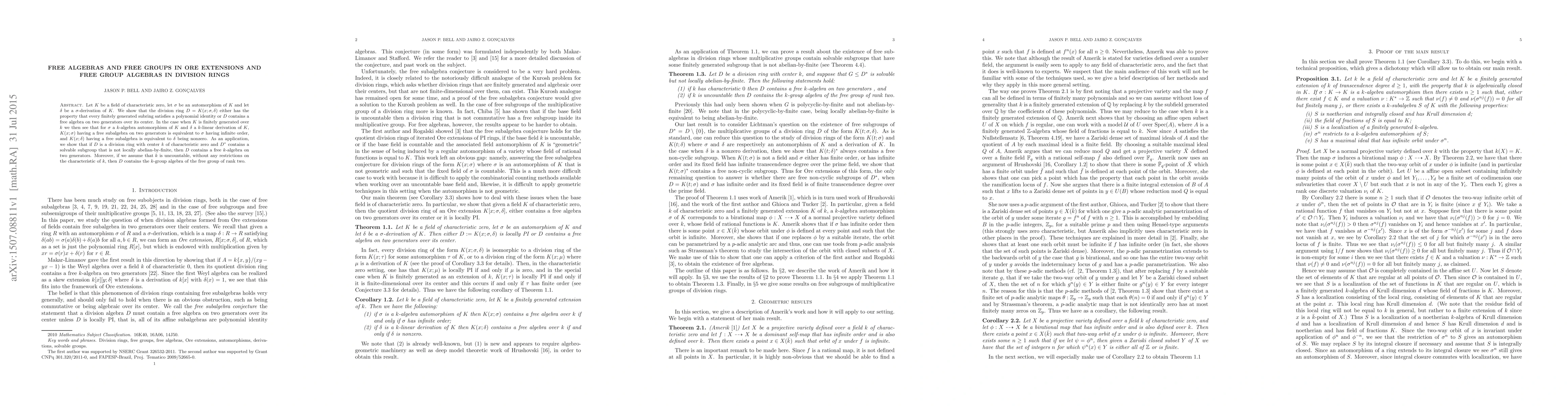 The paper explores properties of division rings $D=K(x;sigma,delta)$, demonstrating that they either satisfy a polynomial identity or contain a free algebra on two generators over their center. For $K$ finitely generated over a subfield $k$, it's shown that $K(x;sigma)$ having a free subalgebra implies $sigma$ is of infinite order, and $K(x;delta)$ having a free subalgebra implies $delta$ is nonzero. The research also reveals that a division ring with specific conditions contains a free $k$-algebra on two generators or the $k$-group algebra of a free group of rank two, assuming $k$ is uncountable.