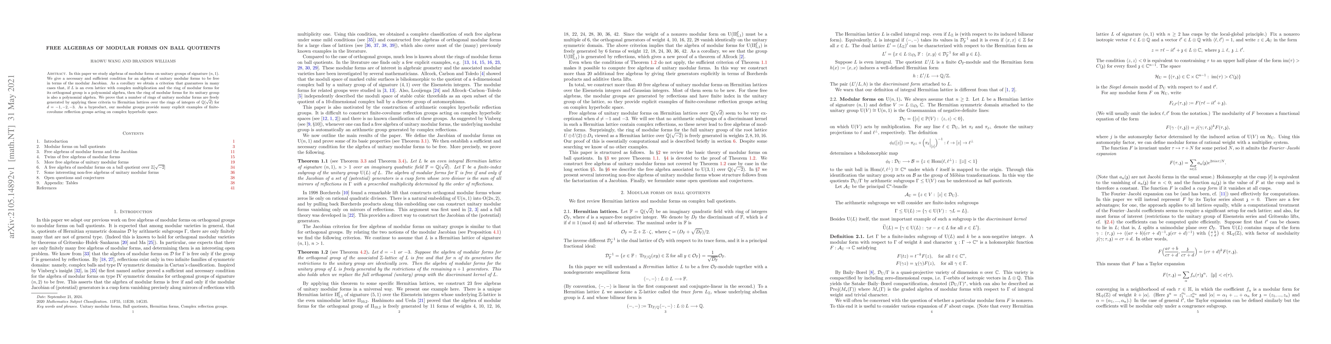 This paper establishes a condition for algebras of modular forms on unitary groups to be free, using the modular Jacobian, and applies this to show that certain rings of modular forms for Hermitian lattices are polynomial algebras, providing explicit examples of finite-covolume reflection groups in complex hyperbolic space.