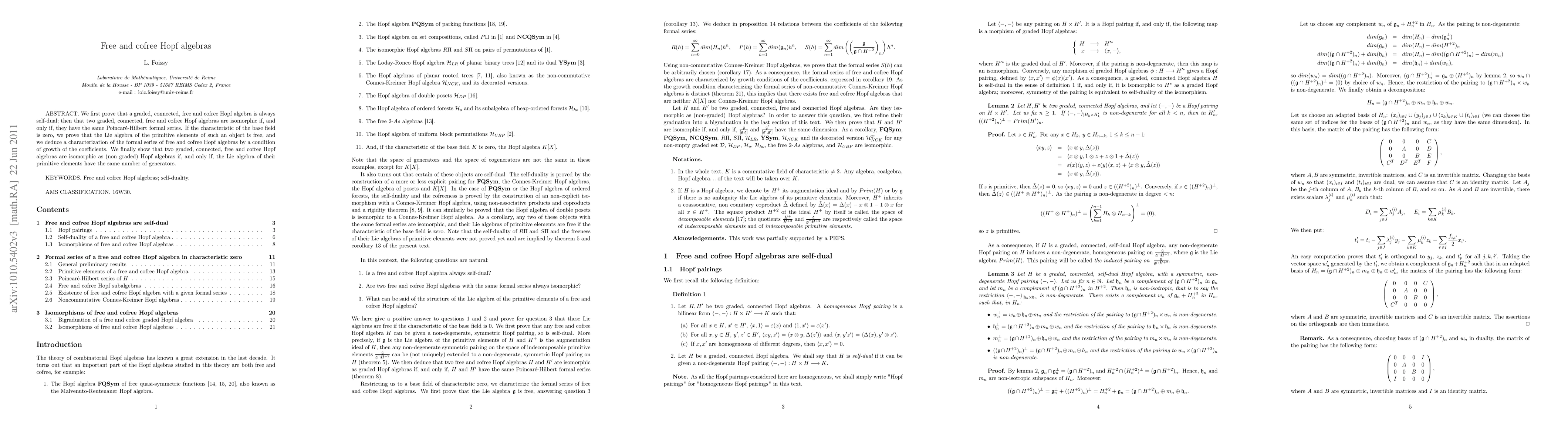 This paper proves that graded, connected, free, and cofree Hopf algebras are self-dual and isomorphic if they share the same Poincaré-Hilbert series. For fields of characteristic zero, it shows that the Lie algebra of primitive elements is free and characterizes such Hopf algebras by coefficient growth conditions. It concludes by establishing isomorphism of these Hopf algebras if their Lie algebras of primitive elements have the same number of generators.