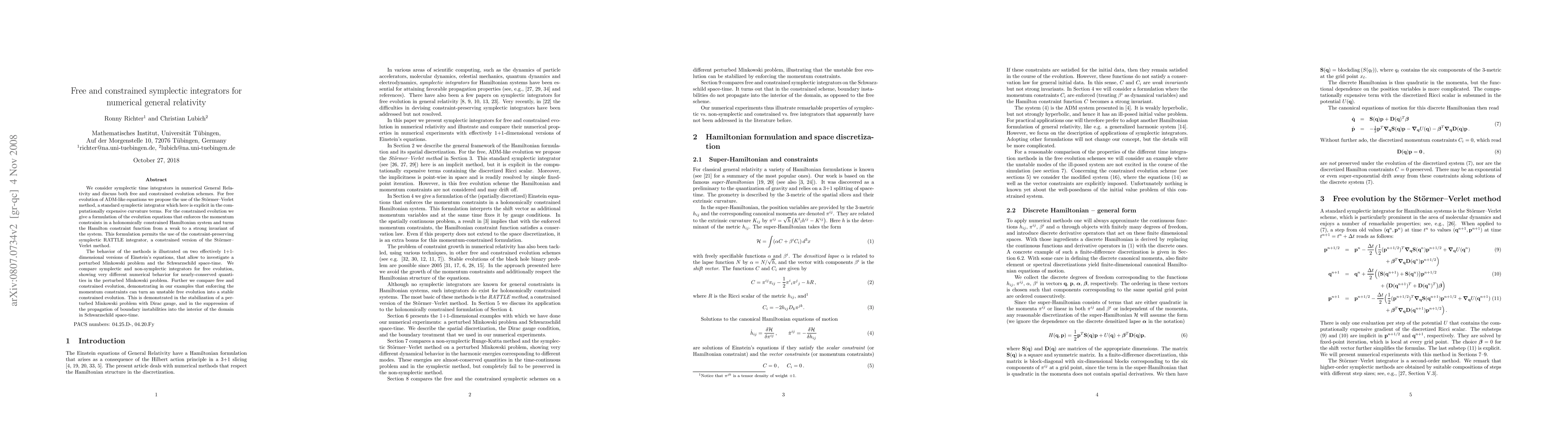 This paper proposes symplectic integrators for numerical General Relativity, specifically using the Stoermer-Verlet method for free evolution and the RATTLE integrator for constrained evolution, demonstrating improved stability and constraint satisfaction in simulations.