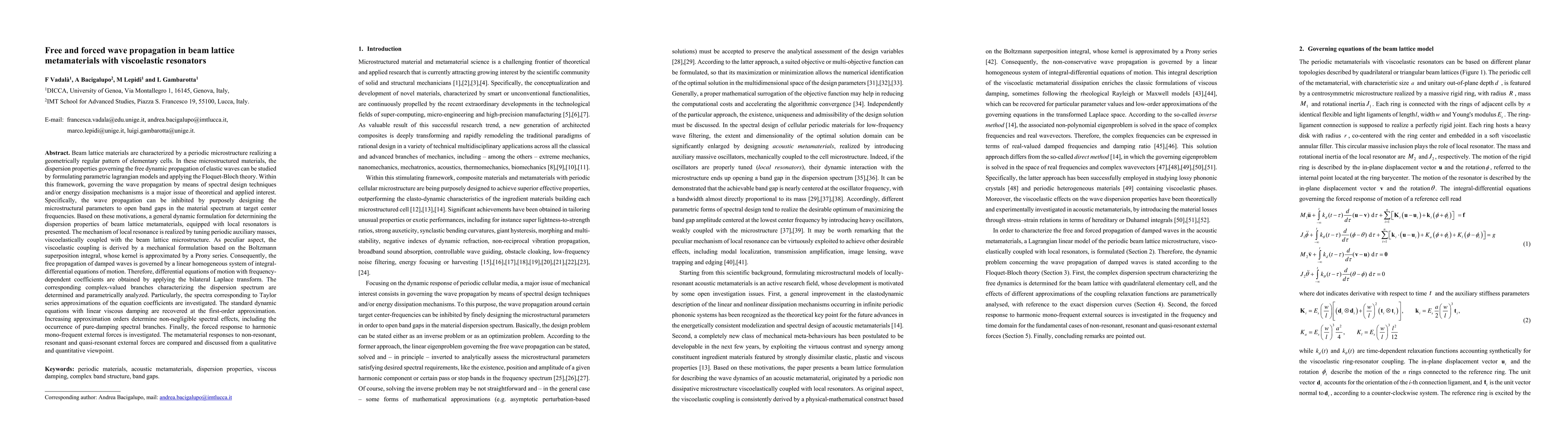 Beam lattice materials are characterized by a periodic microstructure realizing a geometrically regular pattern of elementary cells. In these microstructured materials, the dispersion properties governing the free dynamic propagation of elastic waves can be studied by formulating parametric lagrangian models and applying the Floquet-Bloch theory. Within this framework, governing the wave propagation by means of spectral design techniques and/or energy dissipation mechanisms is a major issue of theoretical and applied interest. Specifically, the wave propagation can be inhibited by purposely designing the microstructural parameters to open band gaps in the material spectrum at target center frequencies. Based on these motivations, a general dynamic formulation for determining the dispersion properties of beam lattice metamaterials, equipped with local resonators is presented. The mechanism of local resonance is realized by tuning periodic auxiliary masses, viscoelastically coupled with the beam lattice microstructure. As peculiar aspect, the viscoelastic coupling is derived by a mechanical formulation based on the Boltzmann superposition integral, whose kernel is approximated by a Prony series. Consequently, the free propagation of damped waves is governed by a linear homogeneous system of integral-differential equations of motion. Therefore, differential equations of motion with frequency-dependent coefficients are obtained by applying the bilateral Laplace transform. The corresponding complex-valued branches characterizing the dispersion spectrum are determined and parametrically analyzed. Particularly, the spectra corresponding to Taylor series approximations of the equation coefficients are investigated.