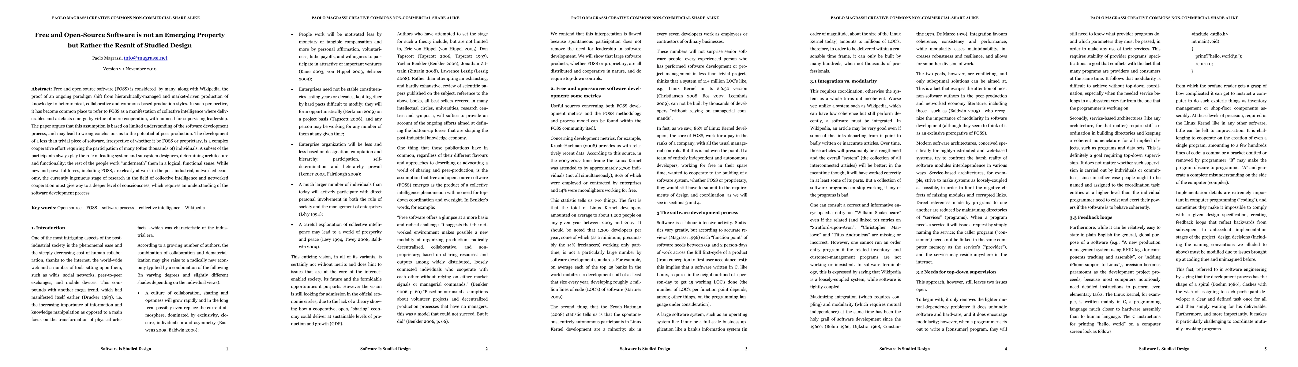 Free and open source software (FOSS) is considered by many, along with Wikipedia, the proof of an ongoing paradigm shift from hierarchically-managed and market-driven production of knowledge to heterarchical, collaborative and commons-based production styles. In such perspective, it has become common place to refer to FOSS as a manifestation of collective intelligence where deliverables and artefacts emerge by virtue of mere cooperation, with no need for supervising leadership. The paper argues that this assumption is based on limited understanding of the software development process, and may lead to wrong conclusions as to the potential of peer production. The development of a less than trivial piece of software, irrespective of whether it be FOSS or proprietary, is a complex cooperative effort requiring the participation of many (often thousands of) individuals. A subset of the participants always play the role of leading system and subsystem designers, determining architecture and functionality; the rest of the people work "underneath" them in a logical, functional sense. While new and powerful forces, including FOSS, are clearly at work in the post-industrial, networked econ-omy, the currently ingenuous stage of research in the field of collective intelligence and networked cooperation must give way to a deeper level of consciousness, which requires an understanding of the software development process.