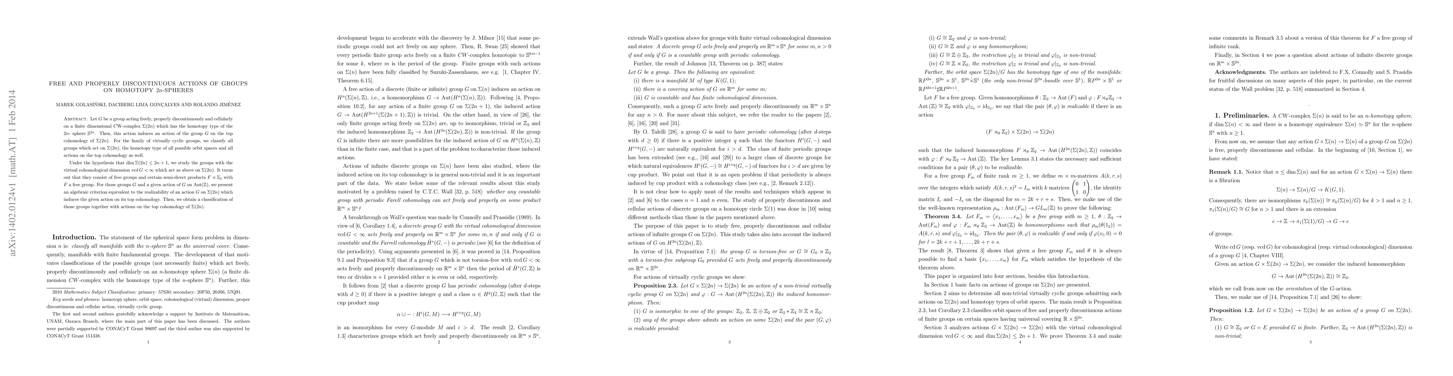 Let $G$ be a group acting freely, properly discontinuously and cellularly on a finite dimensional $C$W-complex $\Sigma(2n)$ which has the homotopy type of the $2n$- sphere $\mathbb{S}^{2n}$. Then, this action induces an action of the group $G$ on the top cohomology of $\Sigma(2n)$. For the family of virtually cyclic groups, we classify all groups which act on $\Sigma(2n)$, the homotopy type of all possible orbit spaces and all actions on the top cohomology as well. \par Under the hypothesis that $\mbox{dim}\,\Sigma(2n)\leq 2n+1$, we study the groups with the virtual cohomological dimension $\mbox{vcd}\,G<\infty$ which act as above on $\Sigma(2n)$. It turns out that they consist of free groups and certain semi-direct products $F\rtimes \mathbb{Z}_2$ with $F$ a free group. For those groups $G$ and a given action of $G$ on $\mbox{Aut}(\mathbb{Z})$, we present an algebraic criterion equivalent to the realizability of an action $G$ on $\Sigma(2n)$ which induces the given action on its top cohomology. Then, we obtain a classification of those groups together with actions on the top cohomology of $\Sigma(2n)$.