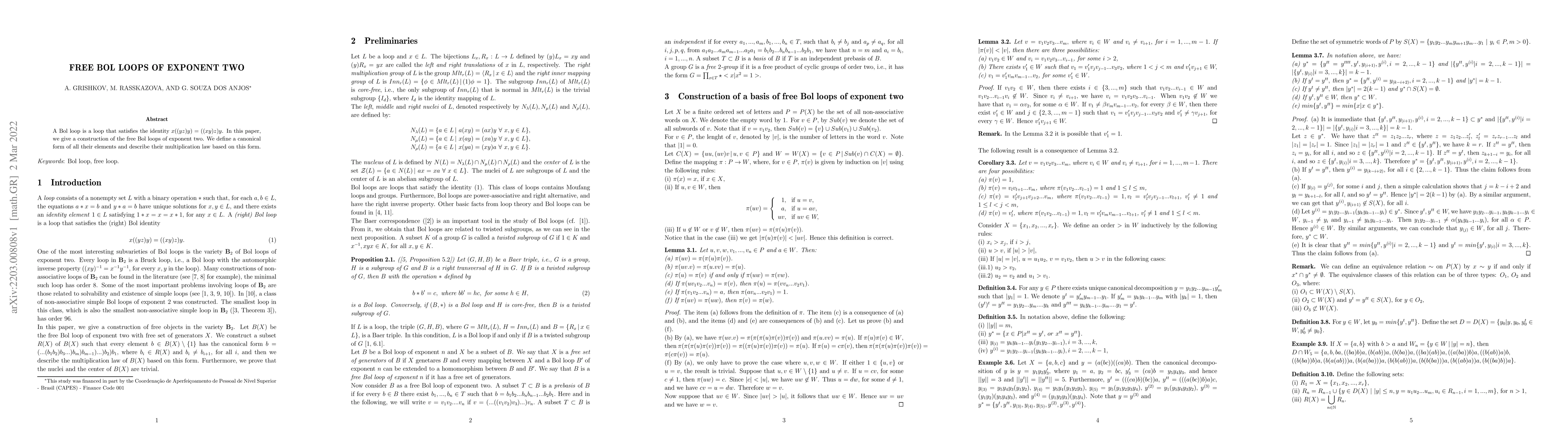 This paper constructs free Bol loops of exponent two, providing a canonical form for their elements and detailing the multiplication law derived from this form. The focus is on the specific identity that defines Bol loops and their algebraic structure.