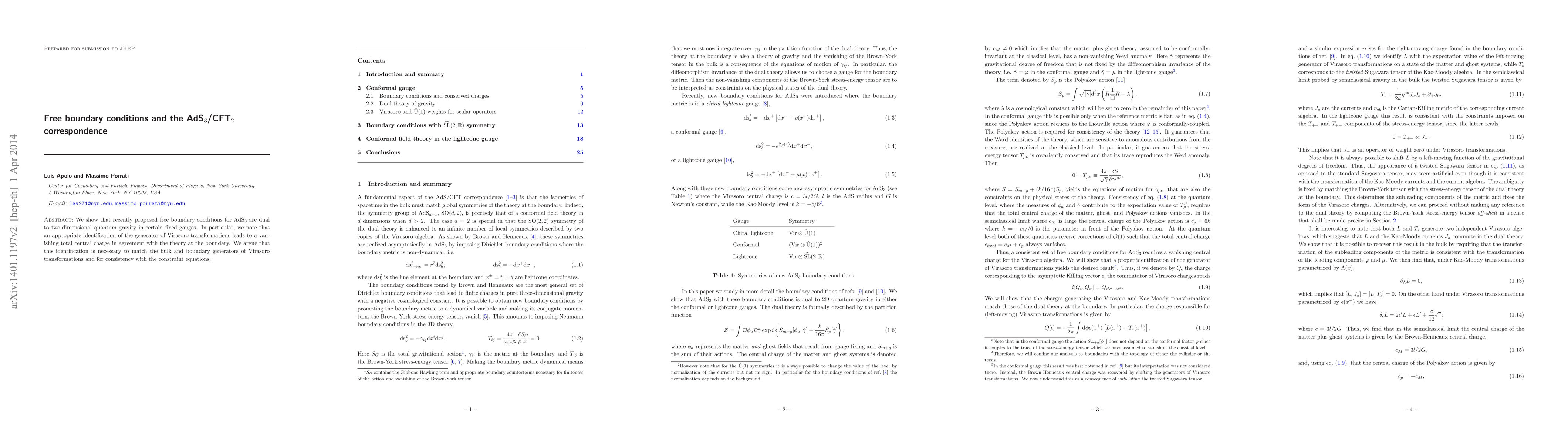 We show that the recently proposed free boundary conditions for AdS$_3$ are dual to two-dimensional quantum gravity in certain fixed gauges. In particular, we note that an appropriate identification of the generator of Virasoro transformations leads to a vanishing total central charge in agreement with the theory at the boundary. We argue that this identification is necessary to match the bulk and boundary generators of Virasoro transformations and for consistency with the constraint equations.