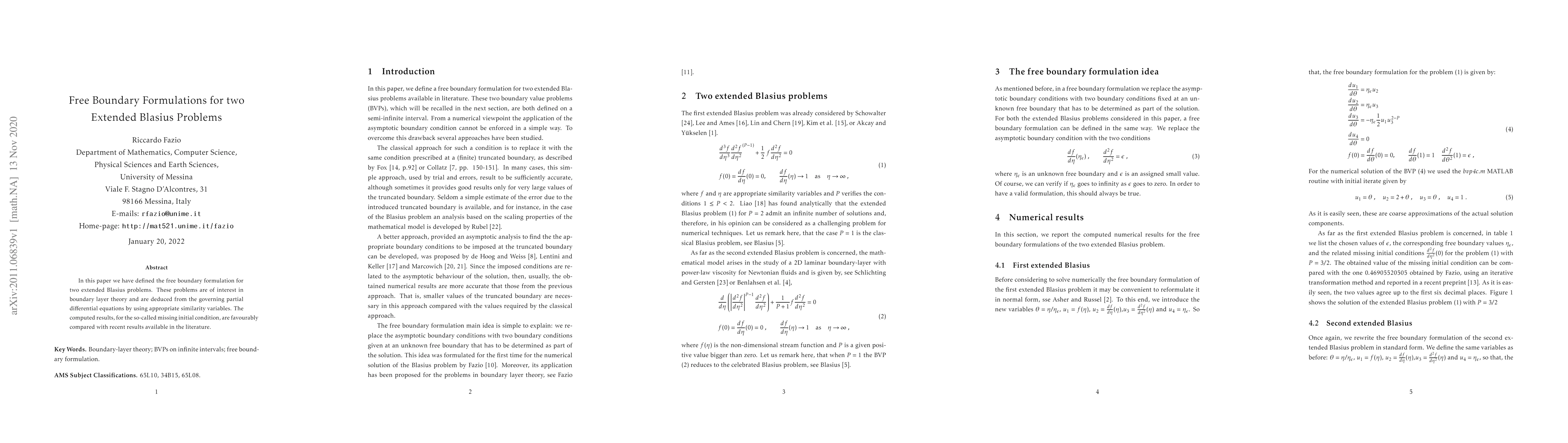 Researchers developed free boundary formulations for two extended Blasius problems, comparing them favourably with existing literature results.