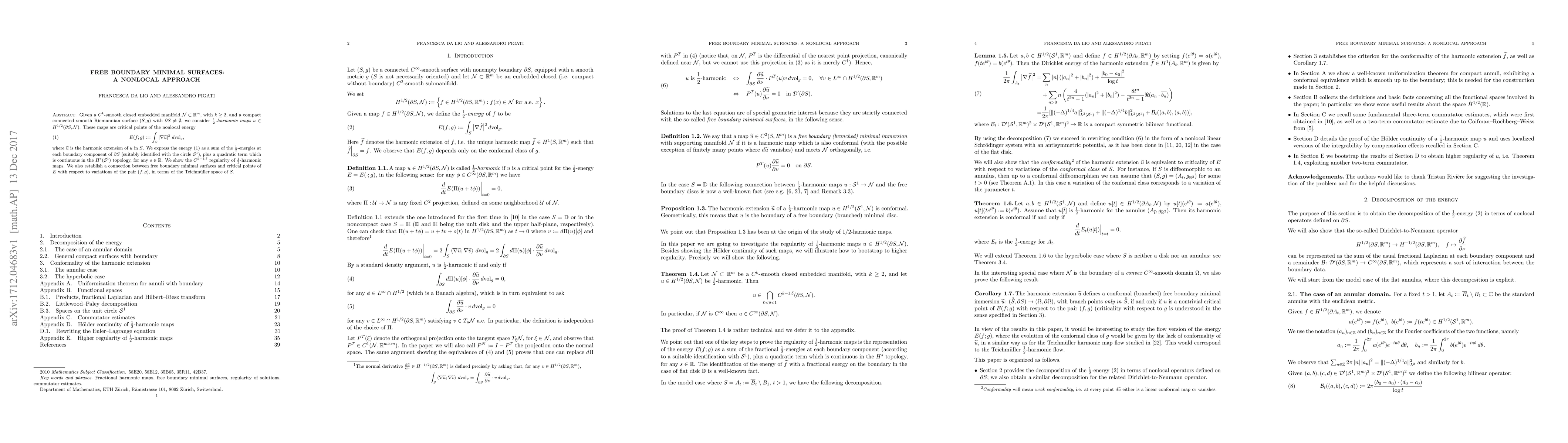 Given a $C^k$-smooth closed embedded manifold $\mathcal N\subset{\mathbb R}^m$, with $k\ge 2$, and a compact connected smooth Riemannian surface $(S,g)$ with $\partial S\neq\emptyset$, we consider $\frac 12$-harmonic maps $u\in H^{1/2}(\partial S,\mathcal N)$. These maps are critical points of the nonlocal energy \begin{equation}E(f;g):=\int_S\big|\nabla\widetilde u\big|^2\,d\text{vol}_g,\end{equation} where $\widetilde u$ is the harmonic extension of $u$ in $S$. We express the energy as a sum of the $\frac 12$-energies at each boundary component of $\partial S$ (suitably identified with the circle $\mathcal S^1$), plus a quadratic term which is continuous in the $H^s(\mathcal S^1)$ topology, for any $s\in\mathbb R$. We show the $C^{k-1,\delta}$ regularity of $\frac 12$-harmonic maps. We also establish a connection between free boundary minimal surfaces and critical points of $E$ with respect to variations of the pair $(f,g)$, in terms of the Teichm\"uller space of $S$.