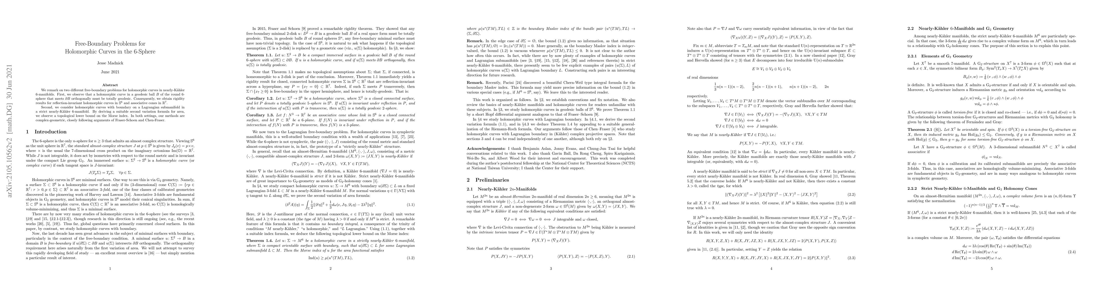 We remark on two different free-boundary problems for holomorphic curves in nearly-K\"{a}hler 6-manifolds. First, we observe that a holomorphic curve in a geodesic ball $B$ of the round 6-sphere that meets $\partial B$ orthogonally must be totally geodesic. Consequently, we obtain rigidity results for reflection-invariant holomorphic curves in $\mathbb{S}^6$ and associative cones in $\mathbb{R}^7$. Second, we consider holomorphic curves with boundary on a Lagrangian submanifold in a strict nearly-K\"{a}hler 6-manifold. By deriving a suitable second variation formula for area, we observe a topological lower bound on the Morse index. In both settings, our methods are complex-geometric, closely following arguments of Fraser-Schoen and Chen-Fraser.